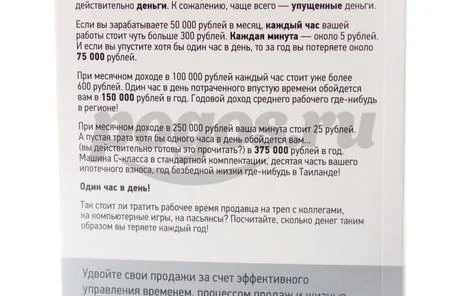 Это единственная книга о том, как менеджеру по продажам быстро удвоить результаты путем грамотного управления своим временем. Ведь чем больше времени вы уделяете продажам, тем больше успешных сделок можете заключить. Книга написана профессиональными продавцами специально для продавцов. Авторы предлагают системный подход к управлению временем в продажах и дают четкие рекомендации, которые можно быстро применить на практике: как правильно расставлять приоритеты, как максимизировать результаты и даже как "создавать время" для дополнительных действий, направленных на увеличение продаж.