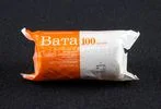 Вата смотана в рулоны и упакована в бумажную этикетку.