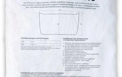 Такой состав автоодеяла позволяет сохранять тепло двигателя на более длительный срок, улучшить шумоизоляцию моторного отсека и выдерживать температуру до 1200 градусов.