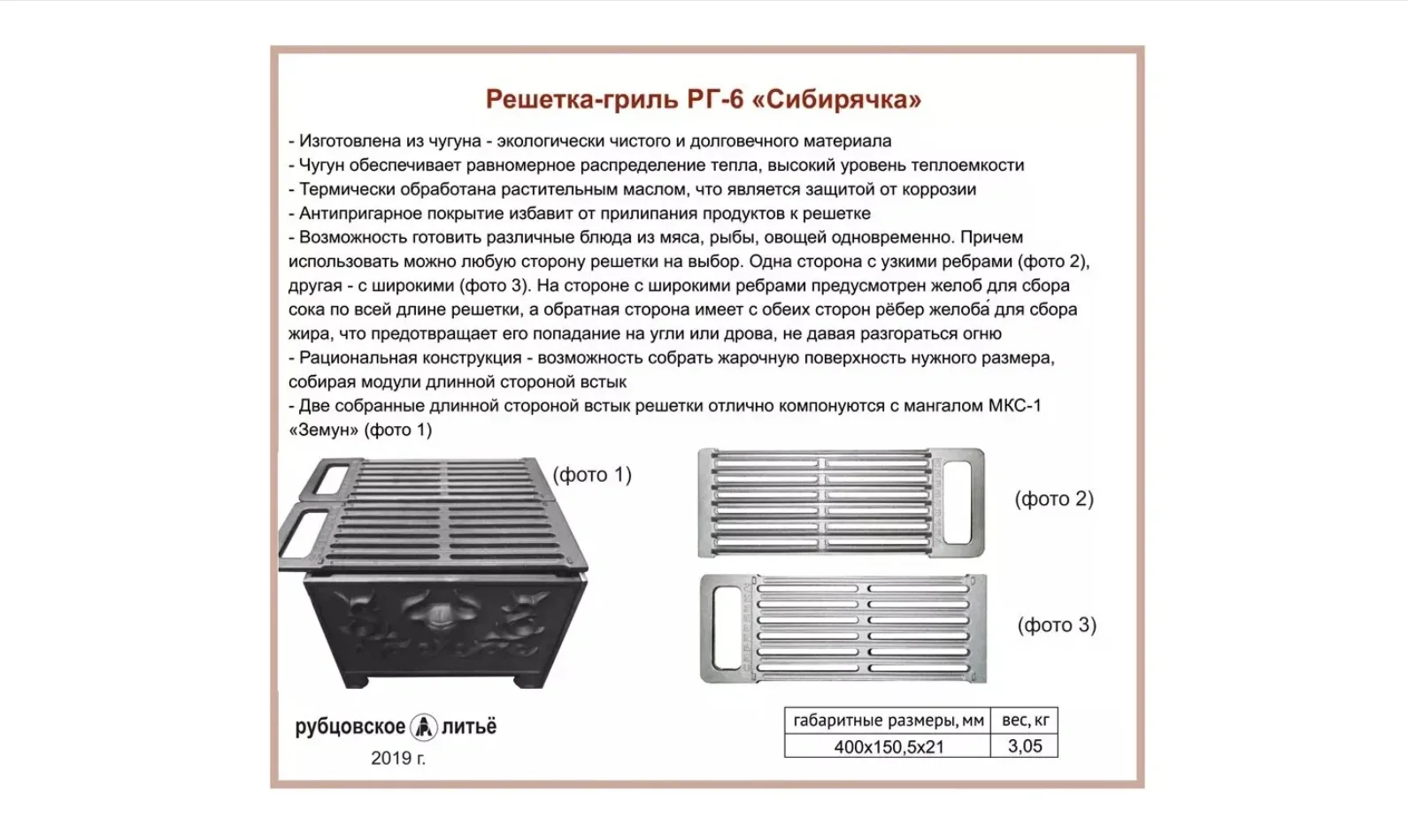 Сборный мангал из чугуна - надежнее не придумаешь. Обратите внимание на фасадное оформление мангала - он станет настоящим украшением вашего приусадебного участка. В таком мангале угли долго будут сохранять свою тепловую энергию, что позволит более экономно расходовать топливо и приготовить сразу несколько блюд на одной закладке. Мангал МКС-1 можно дополнить одной или 2-мя чугунными решетками с удобными ручками, специально изготовленными под этот мангал.