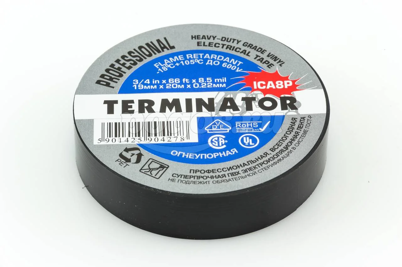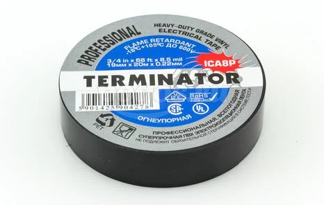 Изолента (черная) 19мм 20м/т0,22мм всепогодная, огнеупорная TERMINATOR, артикул: ICA8P
