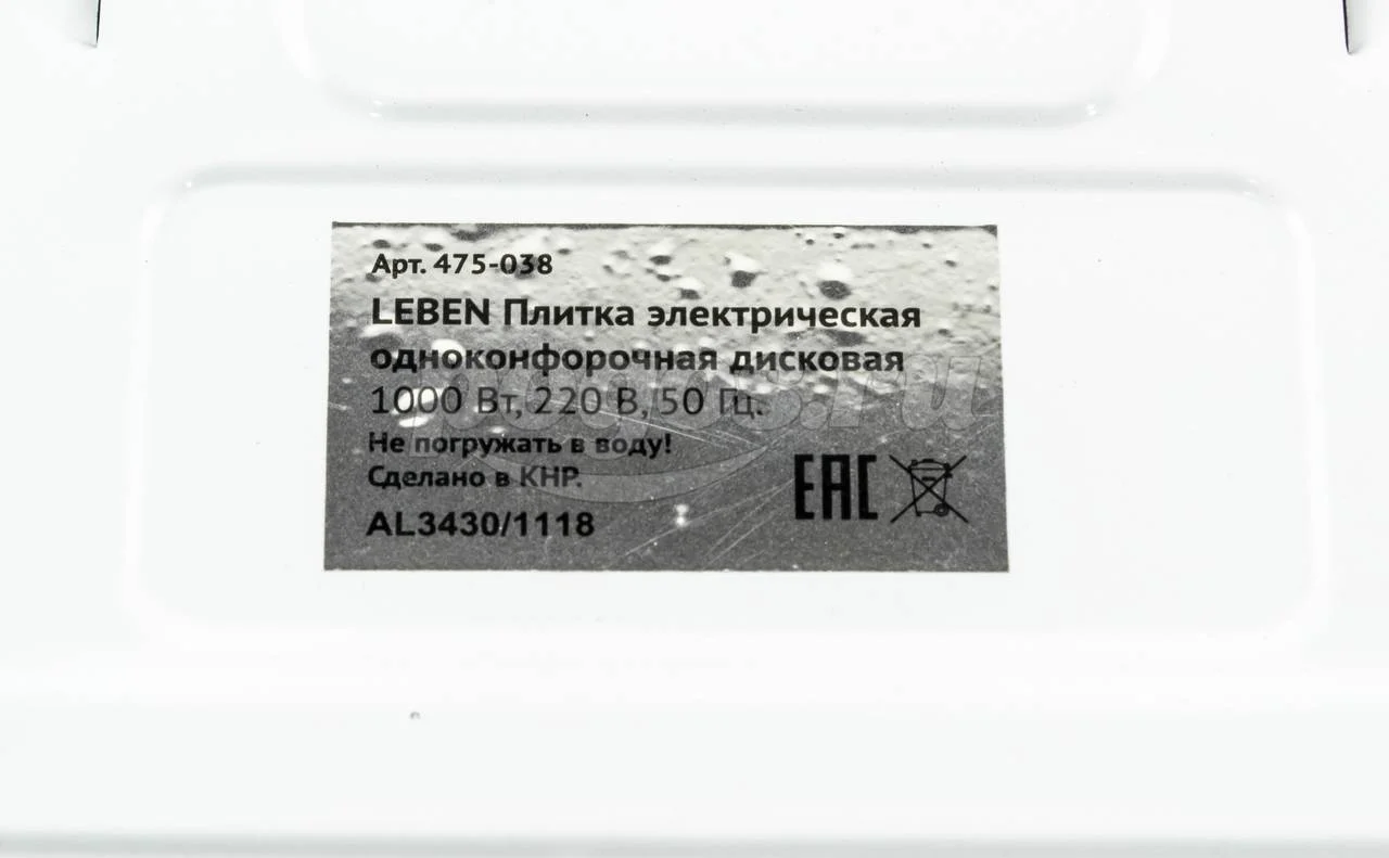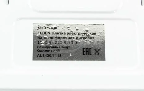 Электроплита 1-а конфорочная 1кВт 220В LEBEN, артикул: 475-038