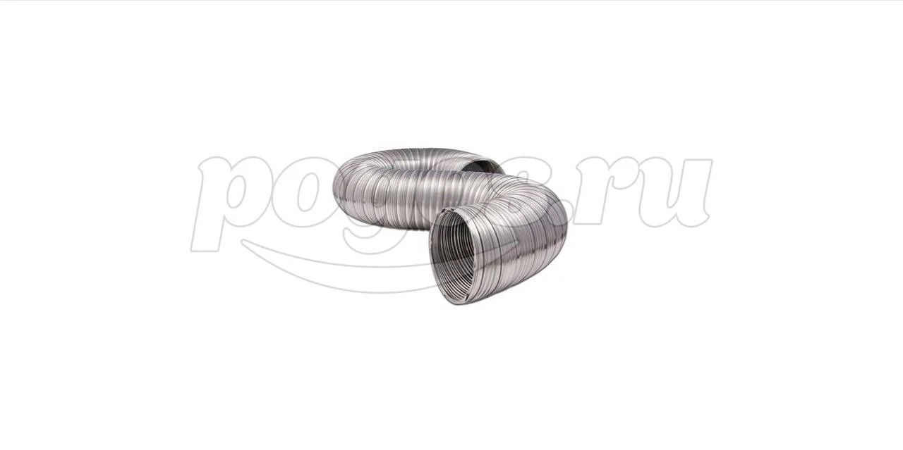 Однослойный полужесткий газоход из нержавеющей стали, толщина стенки 80 мкм, радиус изгиба 2D, рабочая температура до +700°С, максимальная скорость газов 30 м/с., давление 10 000 Па.