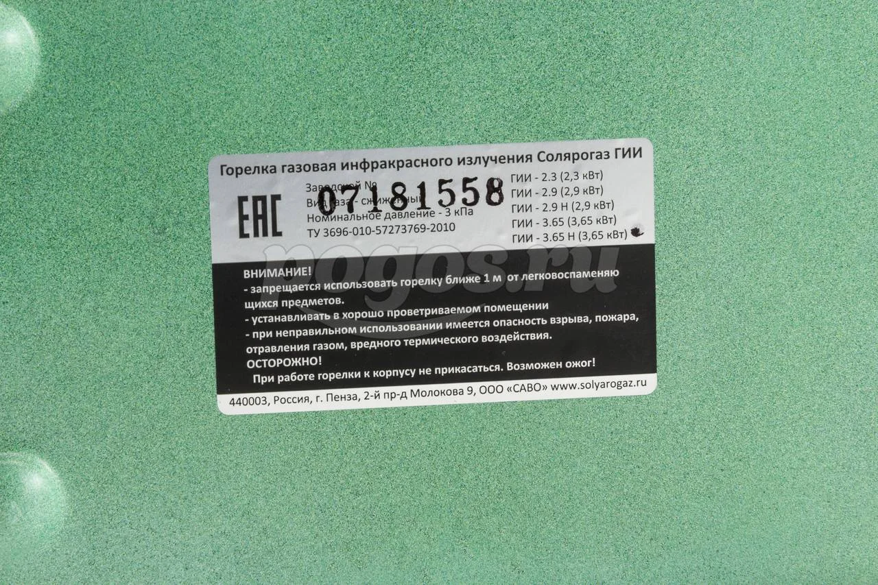 Обогреватель инфракрасный газовый 3,65кВт СОЛЯРГАЗ, артикул: ГИИ-3,65Н