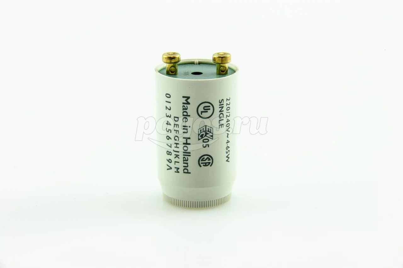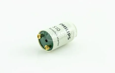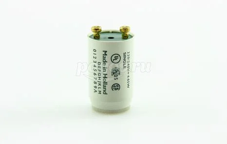 Стартер тлеющего разряда представляет собой лампу с электродами в виде биметаллических пластин, которая помещена в пластиковый корпус с высококачественным помехоподавляющим конденсатором.