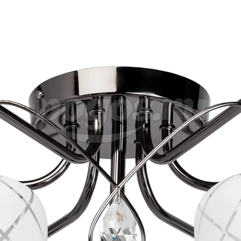 Металлическое основание цвета никеля, стеклянные плафоны, декоративные подвески из прозрачного хрусталя.