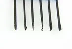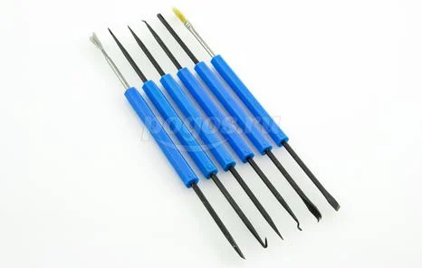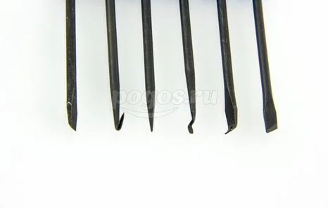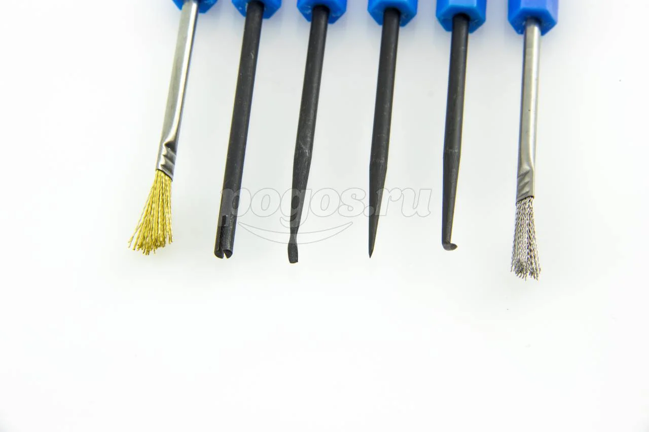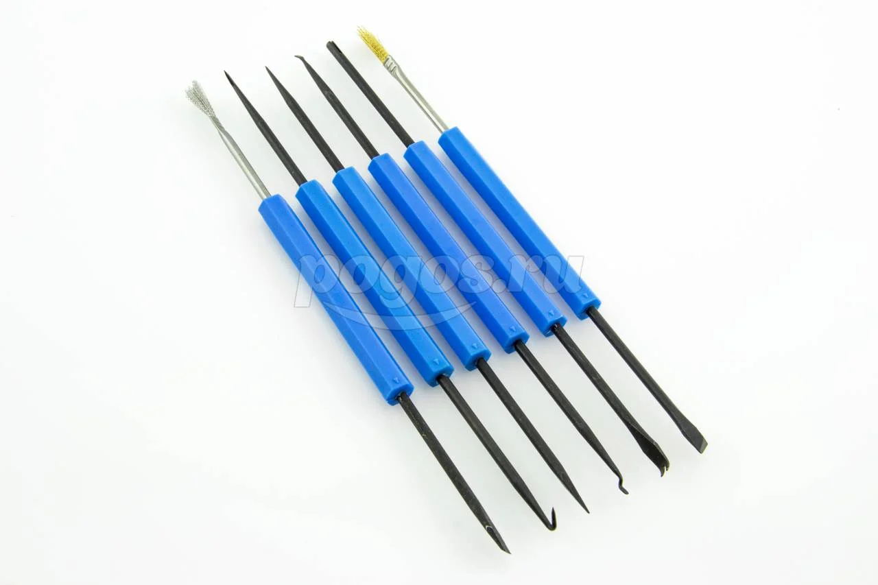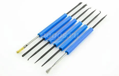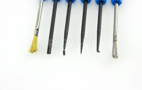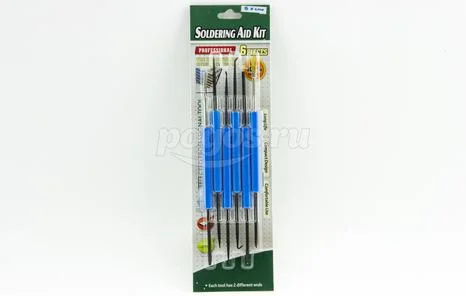Вспомогательный инструмент, используемый при проведении паяльных работ: металлическая кисть для чистки контактов перед пайкой; скребок для удаления остатков припоя; нож - для прорезки дорожек на плате; крючок для извлечения компонентов и выводов; вилка для сгибания/разгибания проводов; шило для чистки и нанесения отметок.