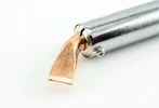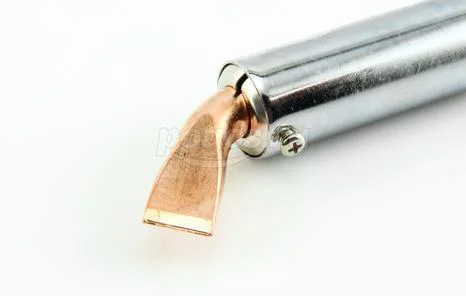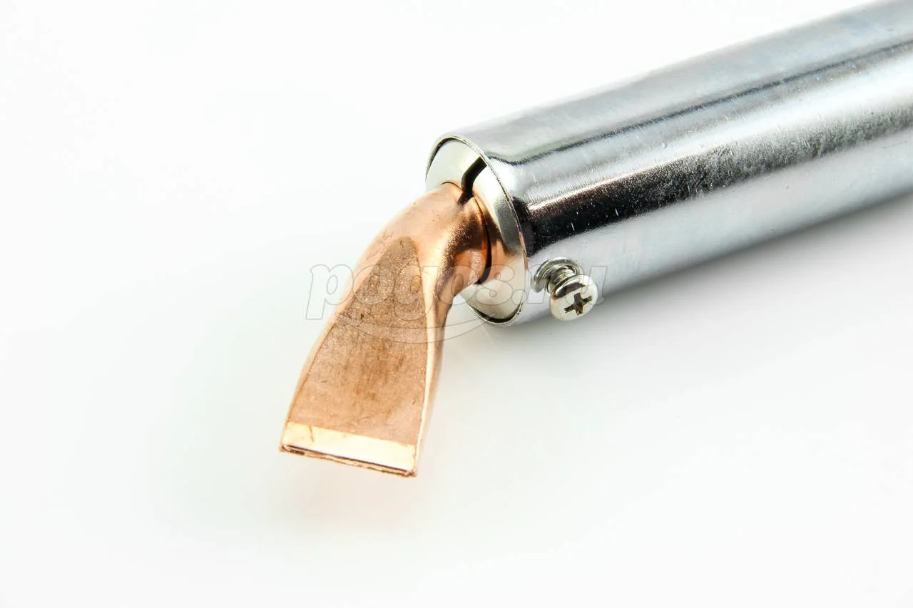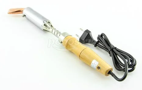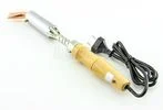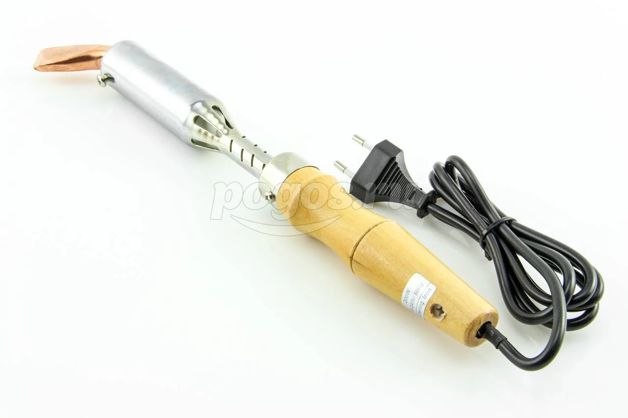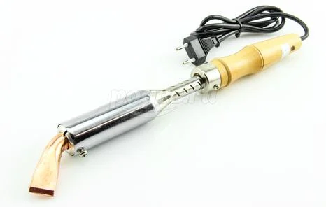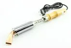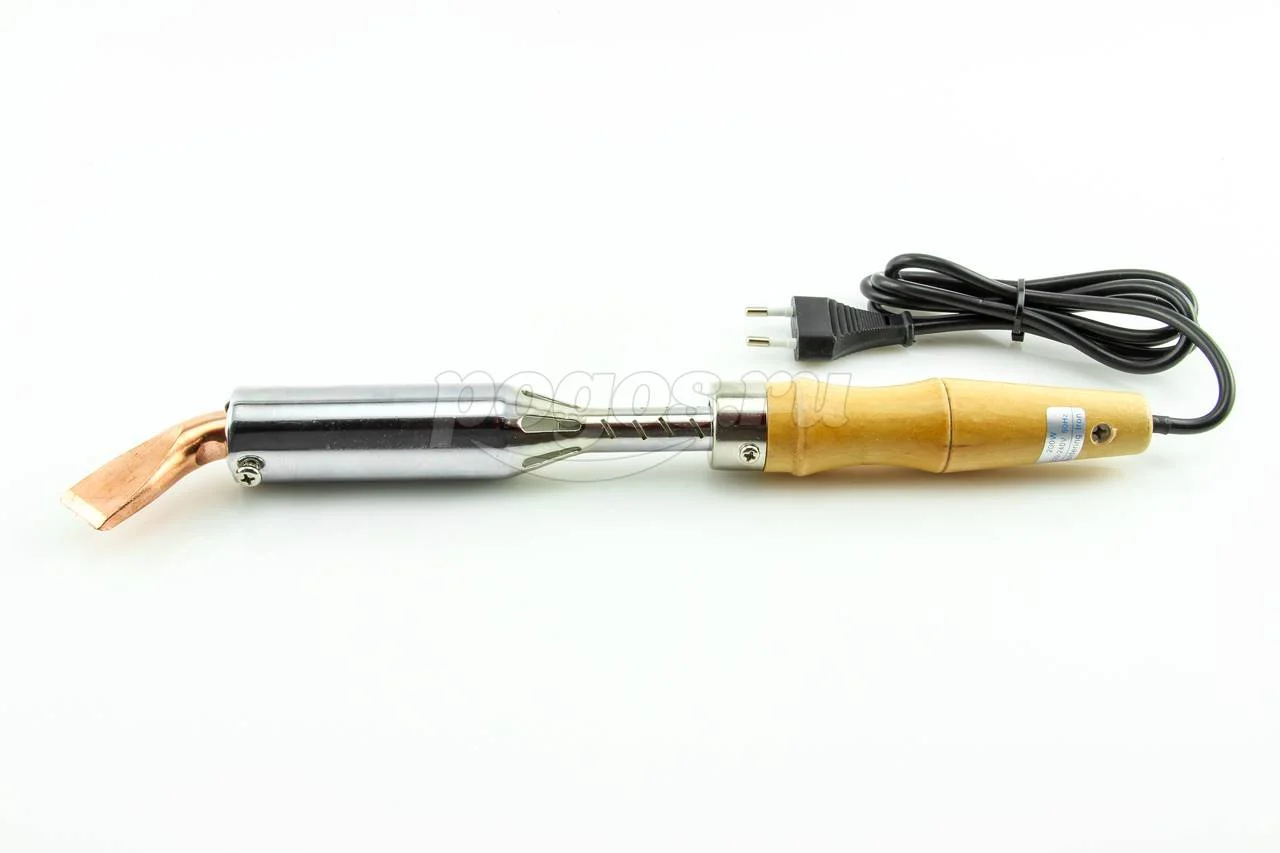 Электрический паяльник мощностью 220 В/ 200Вт с деревянной рукояткой, нихромовым нагревателем и медным загнутым жалом в форме лопатки.