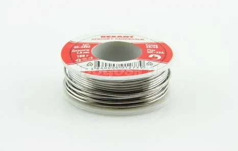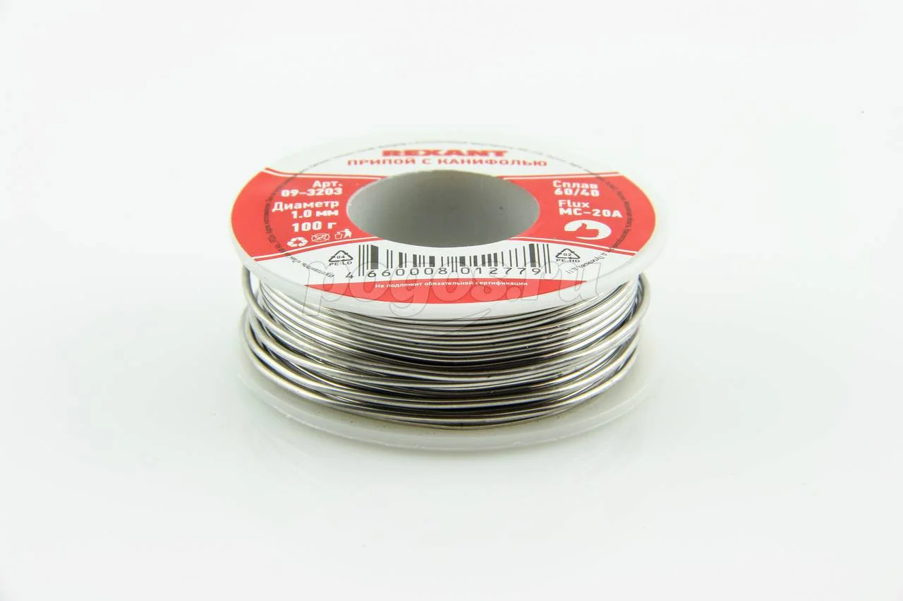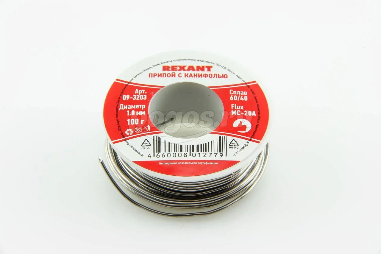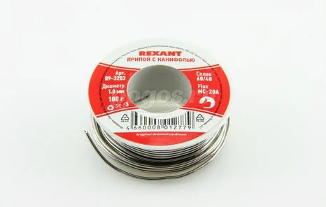 Припой с канифолью REXANT представляет собой проволоку (диаметром 1 мм) из сплава олова (60%) и свинца (40%).