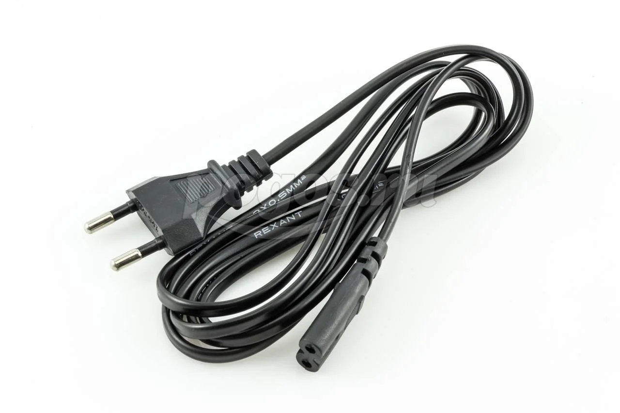 Шнур сетевой 1.8М 2x0.5мм² REXANT предназначен для подключения к сети переменного тока (AC) с напряжением 220B аудио-, видеоаппаратуры, источников питания ноутбуков, игровых консолей и других приборов, имеющих штыревой сетевой разъем типа С8 (известен из-за его формы как "восьмёрка").