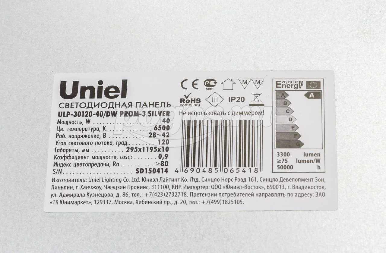 Потолочный светильник LED 40W 295х1195х10мм серебристый Uniel, артикул: ULP-30120