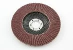 Круг лепестковый торцевой изготовлен из прямоугольных элементов шлифовальной шкурки на тканевой основе, которые расположены в виде веера на подложке из стекловолокна.