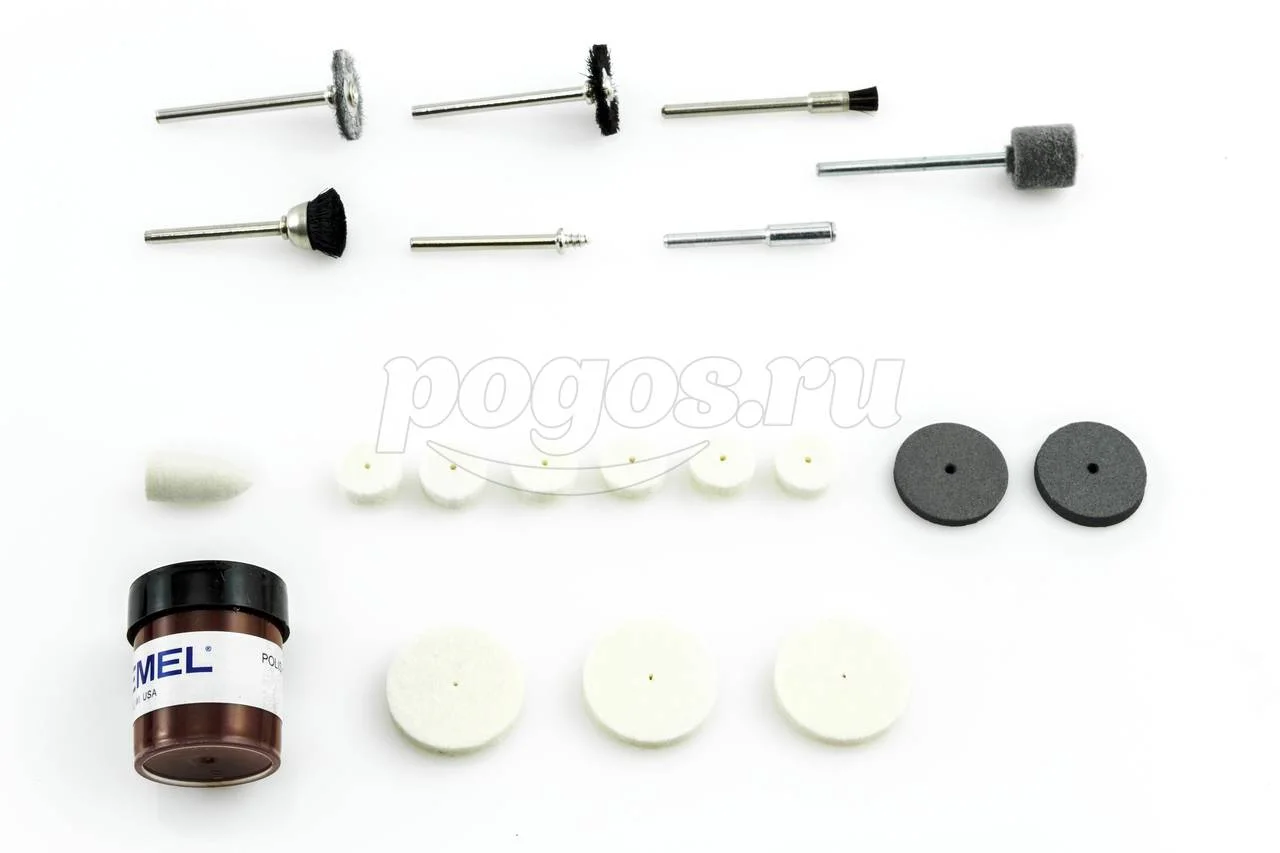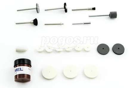В набор входят предметы для выполнения разных операций: шлифовки, полировки, чистки.