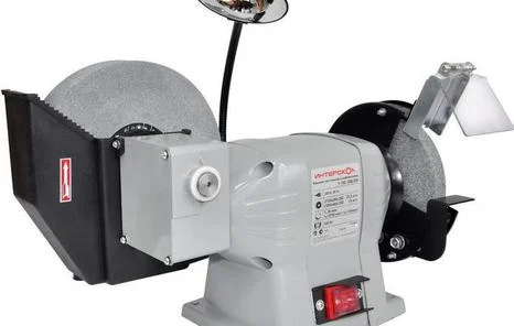 Электроточило Интерскол Т-150-200/250 - надежная машина, которая предназначена для заточки режущего инструмента, используемого для работы на металлообрабатывающих станках, а также для заточки ножей и топоров. Устройство устанавливается на столе или верстаке при помощи болтов для устойчивости во время работы. Точило имеет два круга, изготовленных из нормального электрокорунда. Правый установлен на валу двигателя, а левый повернут на 90 градусов и расположен вдоль мотора, нижняя его часть помещена в емкость с водой для формирования режущих кромок и точной заточки. Машина работает от электрической сети напряжением 220 В.