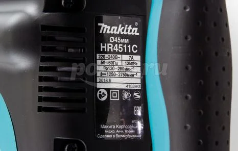 Скорость вращения и частота ударов при работе с перфоратором Makita HR 4511 C регулируется и стабил
