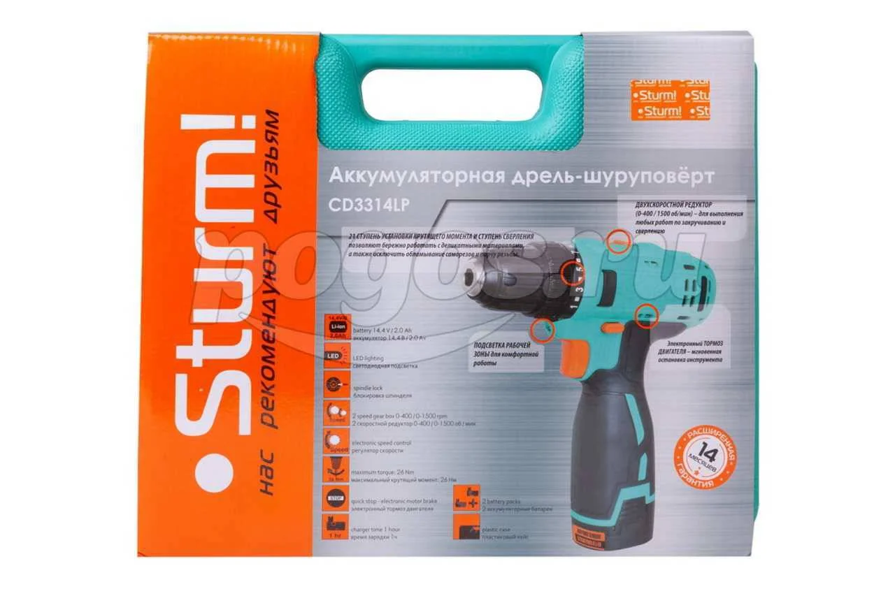 Шуруповерт аккумуляторный 14,4В 2*2Ач Li-Ion 0-400-1500об/мин CD3314LP кейс STURM, артикул: CD3314LP