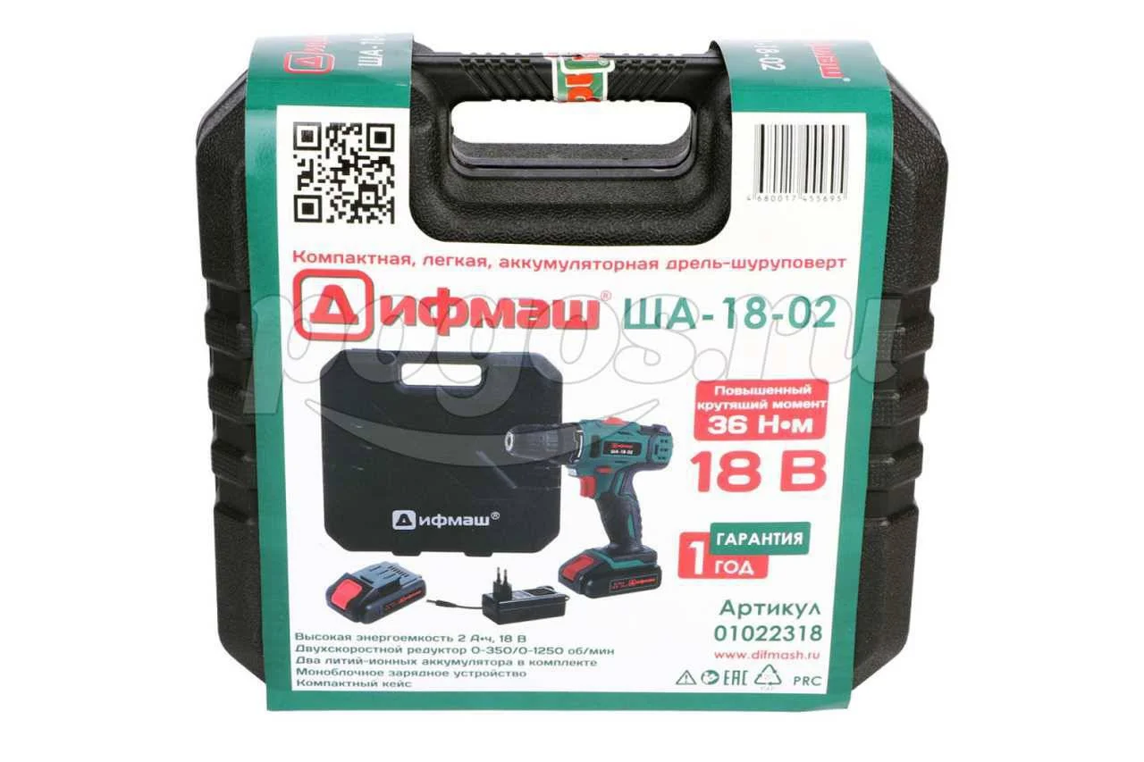 Шуруповерт аккумуляторный 18В 2*2Ач Li-Ion 1250об/мин 36Нм ЗУ кейс ША-18-02 ДИФМАШ, артикул: 01022318