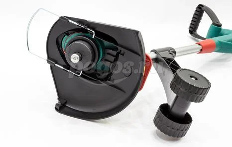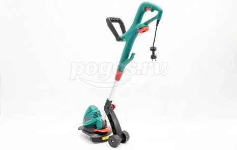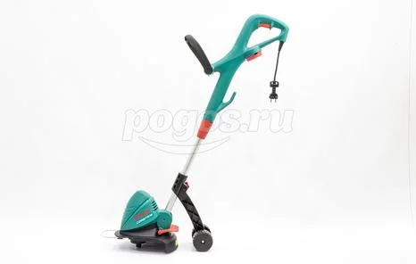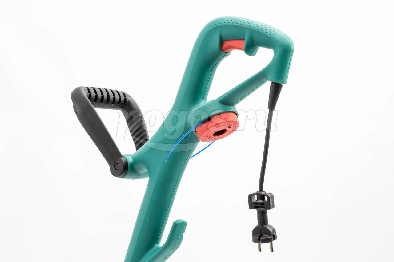 Электрический триммер с двигателем мощностью 500 Вт и насадкой с леской диаметром 1.6 мм в качестве режущего инструмента.