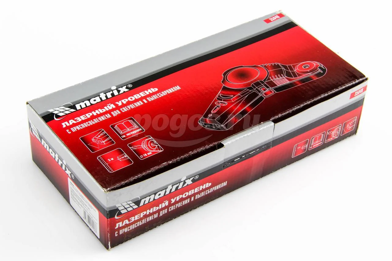 Лазерный уровень с приспособлением для сверления и пылесборником торговой марки MATRIX используется при отделке и декорировании помещений (укладке плитки, монтаже окон и дверей, развешивании картин и пр.), при прокладке трубопровода и электропроводки.