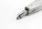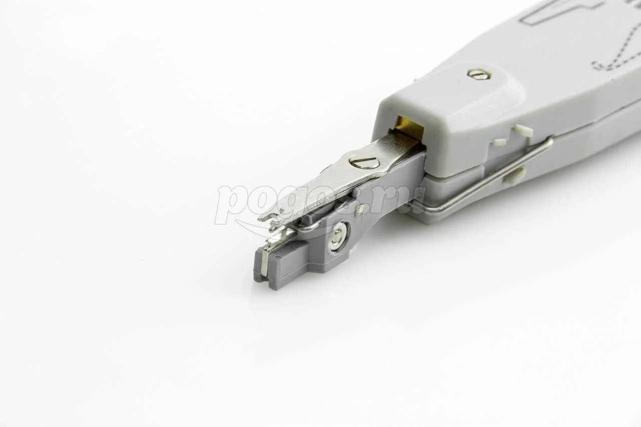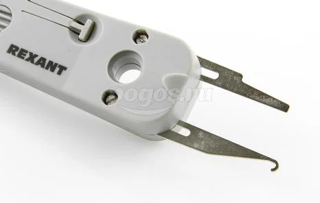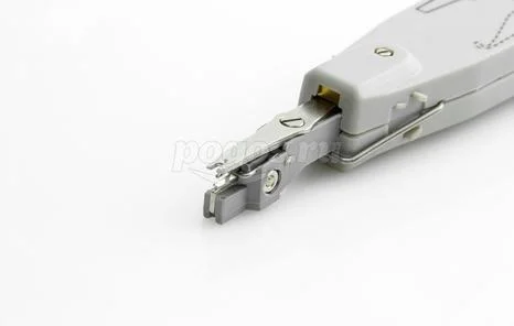 Нож инструмента снабжен ножницами для автоматического отрезания излишка кабеля при заделке контакта, в рукоятке ножа имеются специальные крючки для извлечения кабеля из разъема.
