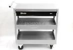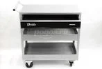Металлическая тележка имеет две секции для хранения, выдвижной ящик и рабочий стол сверху.