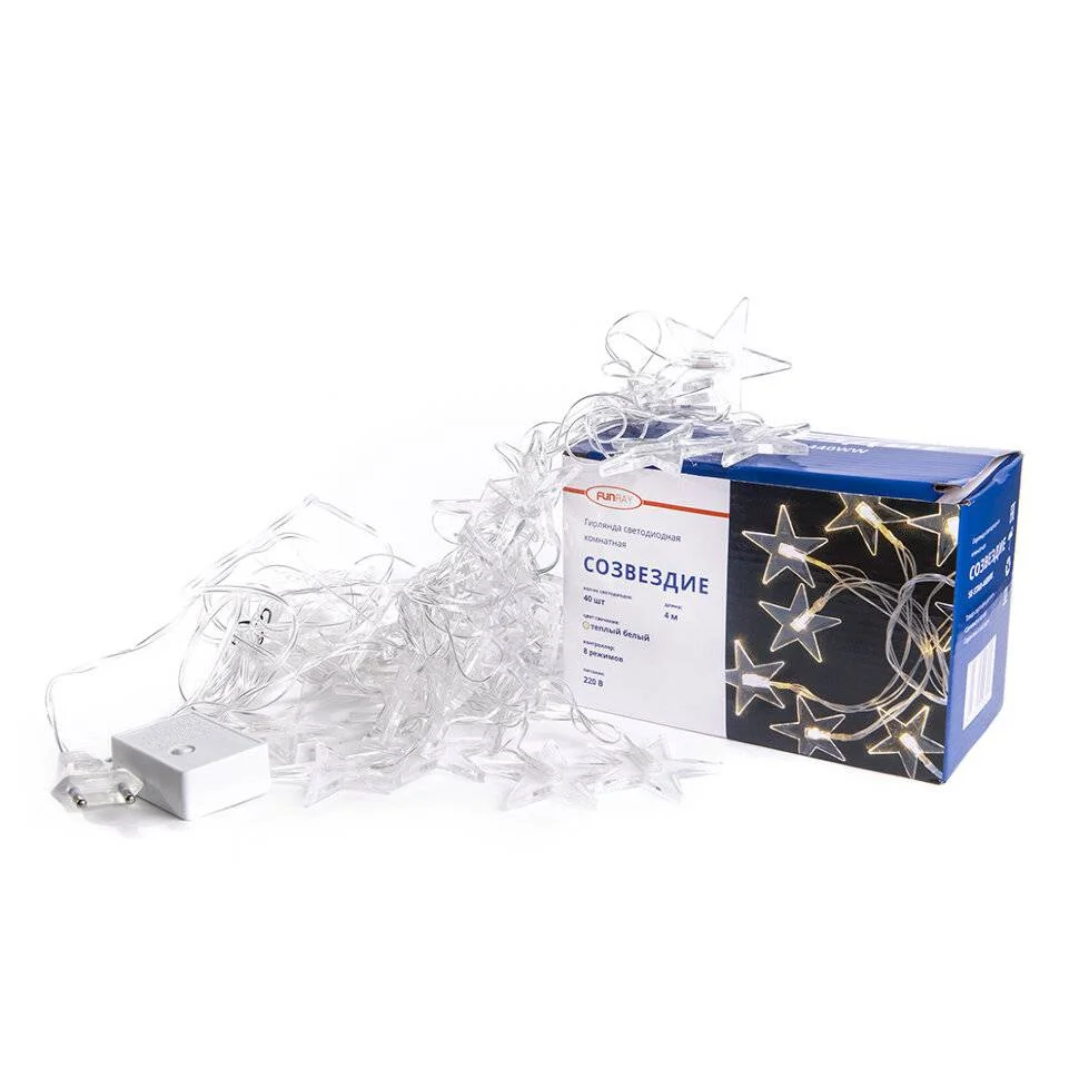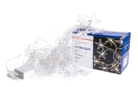 Гирлянда "Созвездие" создаст уютную атмосферу и праздничную обстановку. Пятиконечные звезды светят приятным теплым белым цветом. Гирлянда отлично подойдет для урашения елки или интерьера. Работает в 8 режимах. Длина гирлянды - 4м. Длина шнура от вилки до начала гирлянды - 3м.