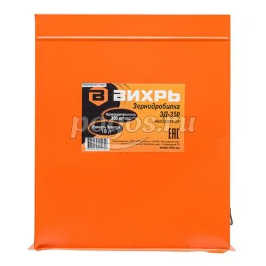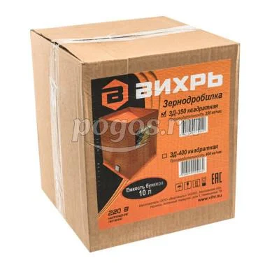 Зернодробилка ВИХРЬ ЗД-350 с однофазным коллекторным электродвигателем состоит из трёх элементов: загрузочной камеры, камеры измельчителя и моторного отсека. Тип бункера квадратный, его ёмкость составляет 10 л. Измельчитель зерна дробит сырьё на мелкие фрагменты при помощи лезвий, а затем пробивает его через сито. Частота вращения ножа: 12000 об/мин.