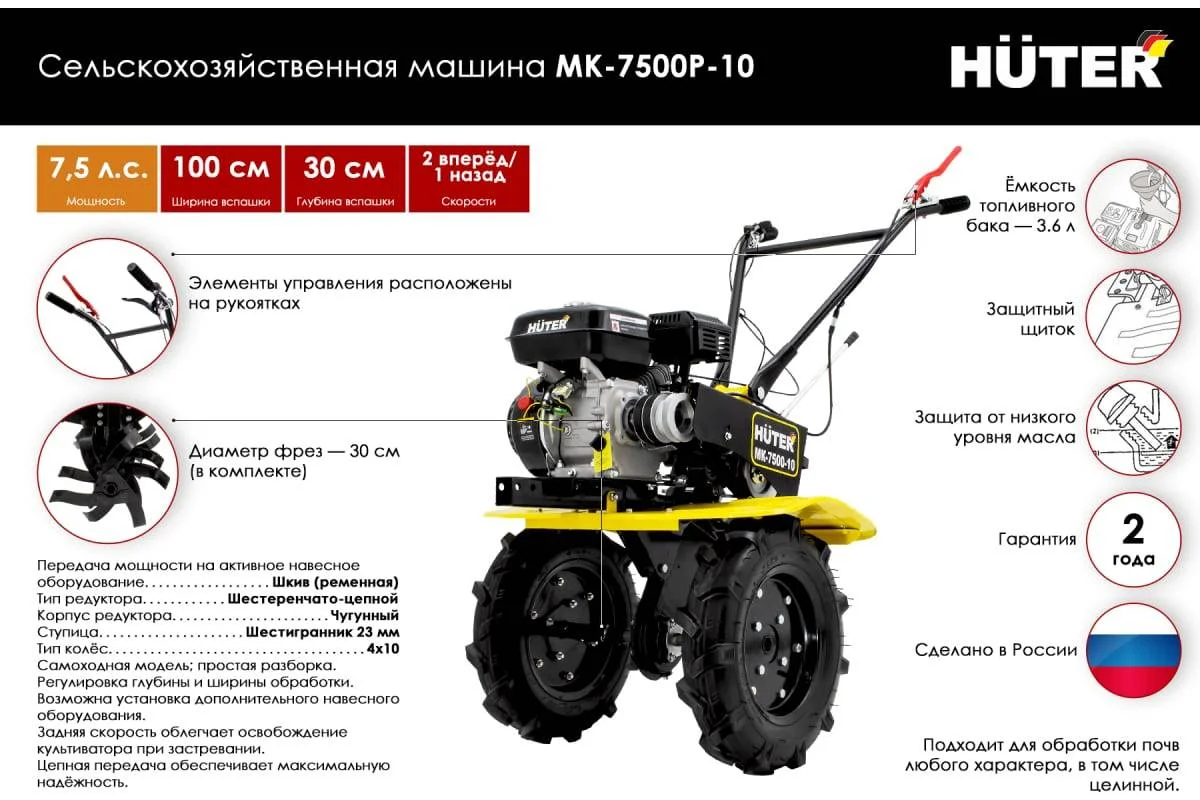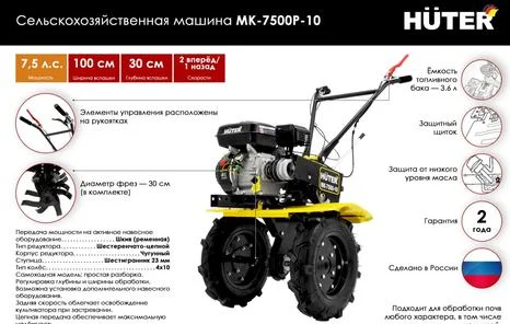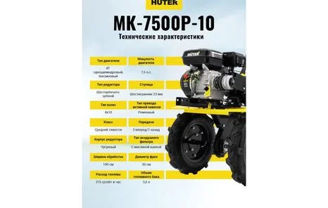 Мотоблок 7,5л.с. бак3,6л ширина 100мм глубина 30см скорость 2/1 HUTER, артикул: 70/5/12