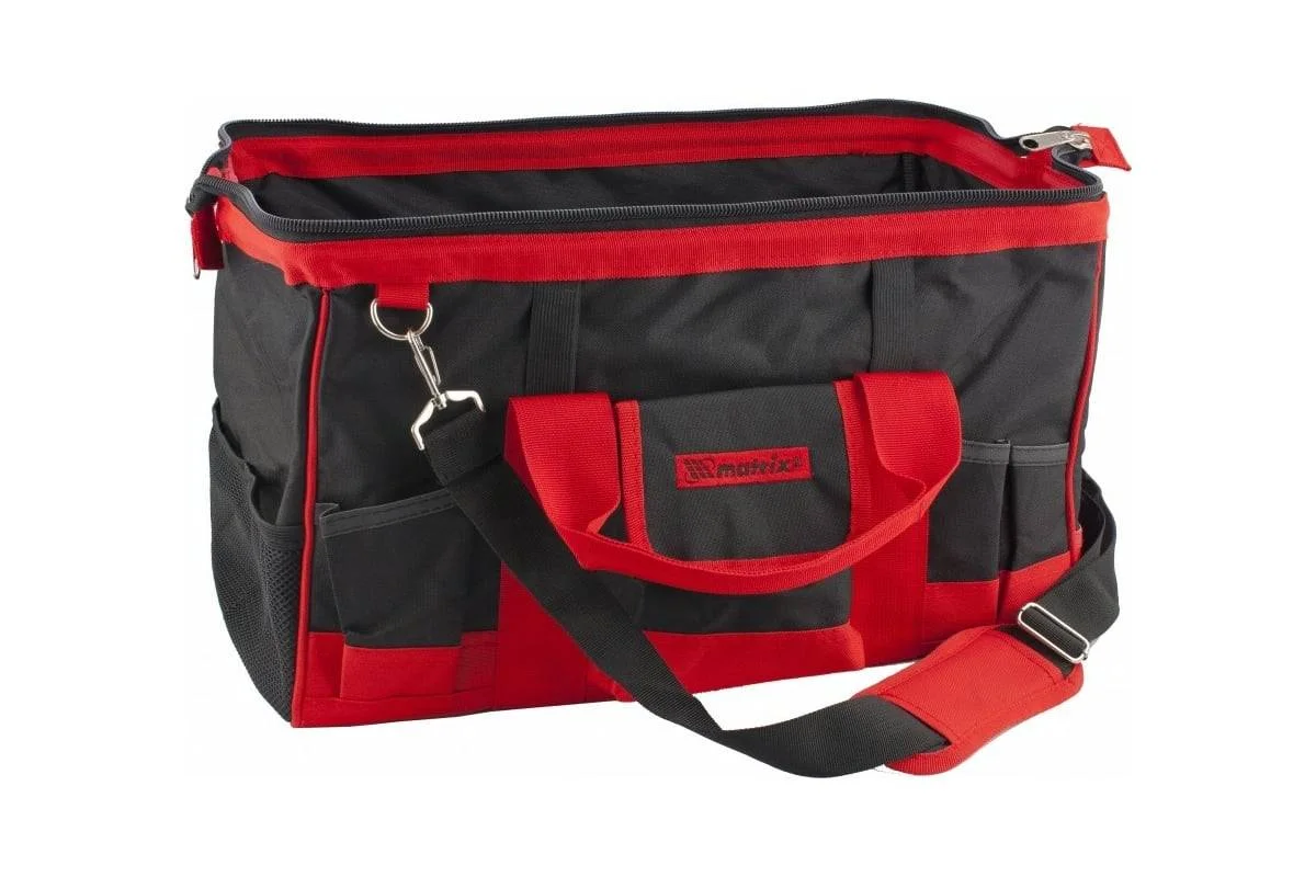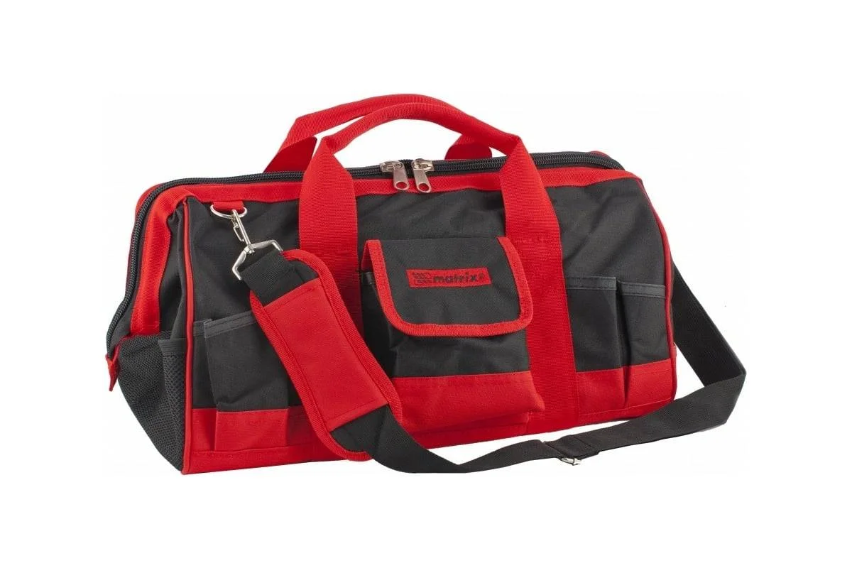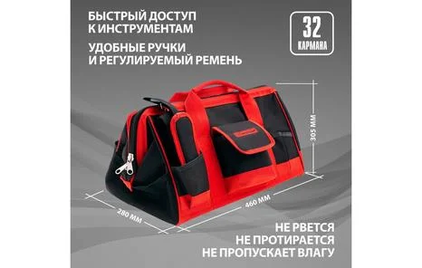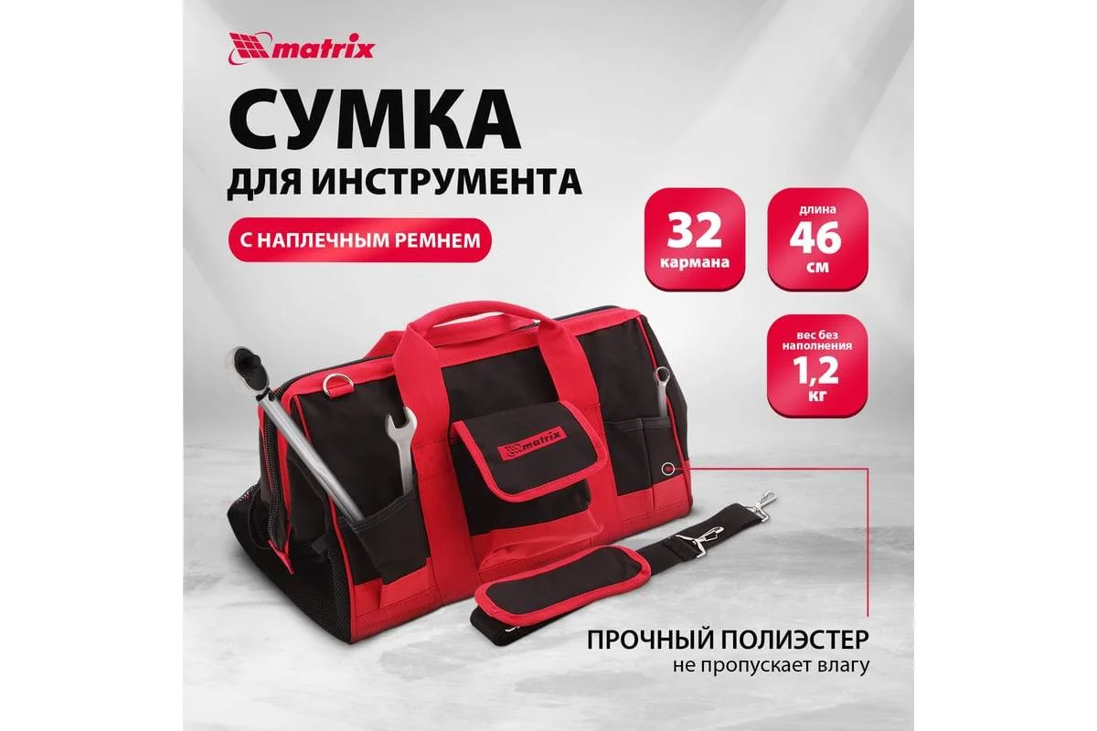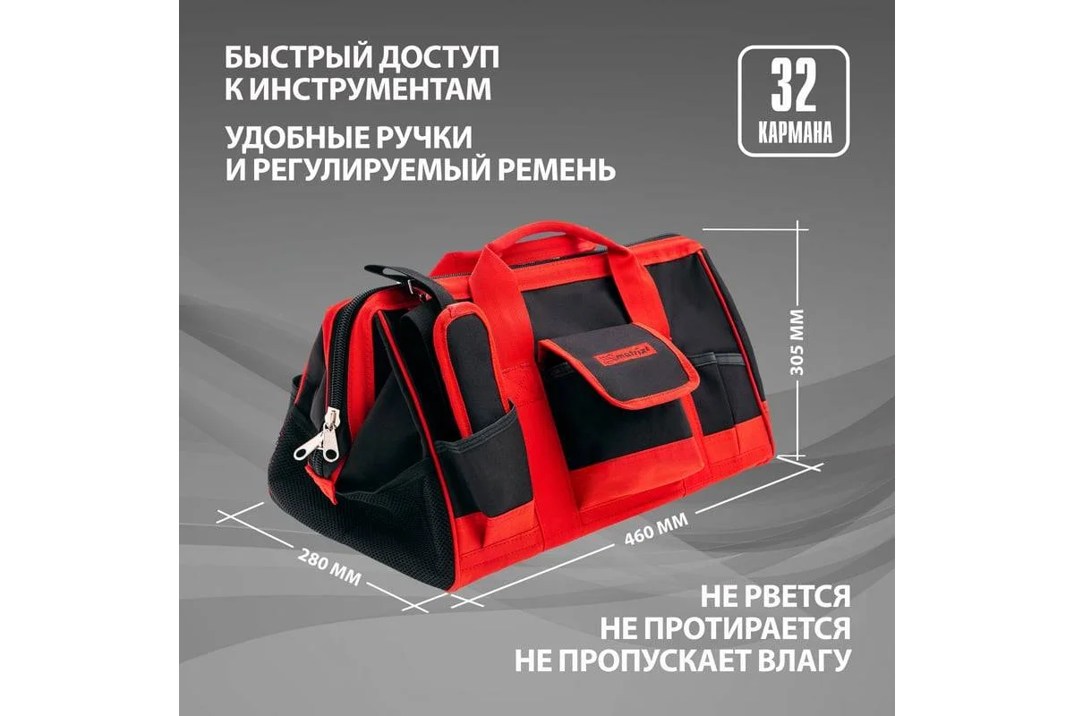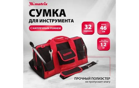 Сумка Matrix 90256 с 32 карманами, 460 х 280 х 305 мм, предназначена для транспортировки и хранения слесарных или столярных инструментов. Может использоваться для перевозки автопринадлежностей. В ней 32 кармана и вместительное основное отделение, в которых можно разместить инструменты разного размера. Сумка комплектуется наплечным ремнем с расширяющей накладкой для удобства переноски. Пригодится монтажникам, слесарям, строителям, будет полезна дома и в поездке.