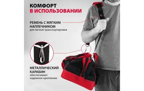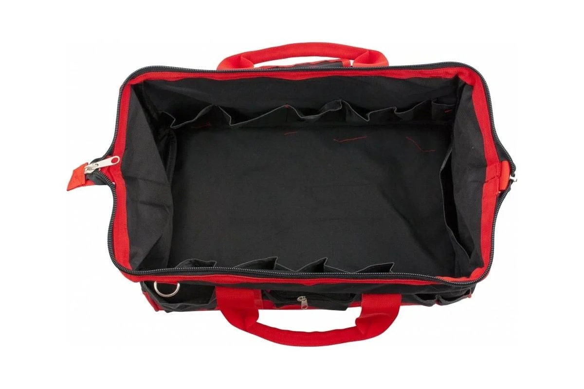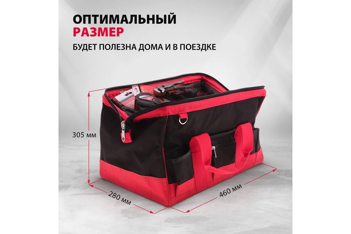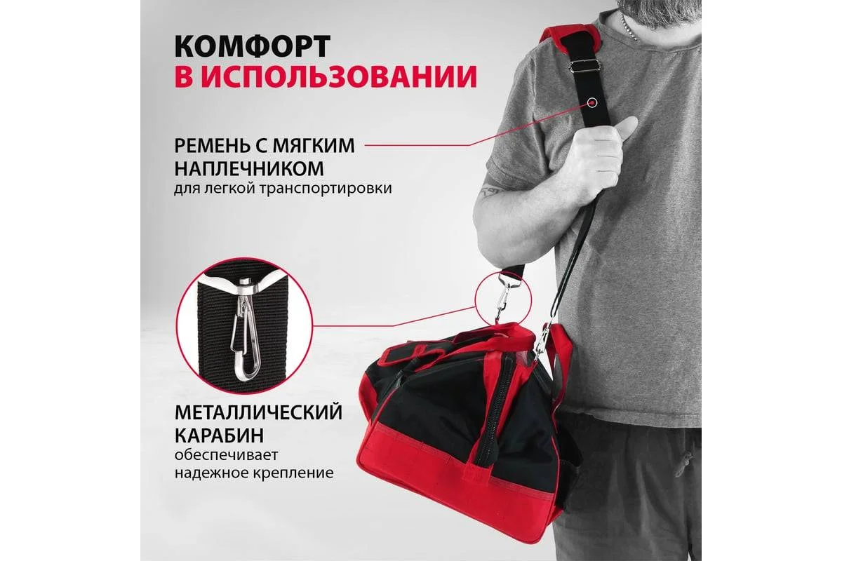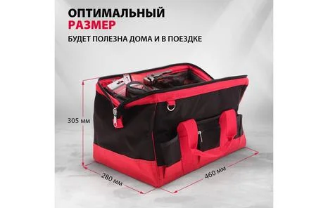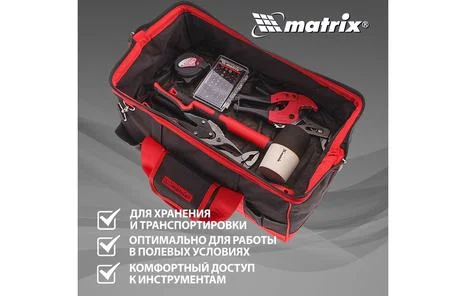 Сумка Matrix 90256 с 32 карманами, 460 х 280 х 305 мм, предназначена для транспортировки и хранения слесарных или столярных инструментов. Может использоваться для перевозки автопринадлежностей. В ней 32 кармана и вместительное основное отделение, в которых можно разместить инструменты разного размера. Сумка комплектуется наплечным ремнем с расширяющей накладкой для удобства переноски. Пригодится монтажникам, слесарям, строителям, будет полезна дома и в поездке.