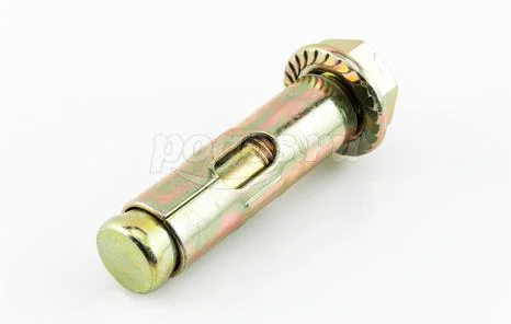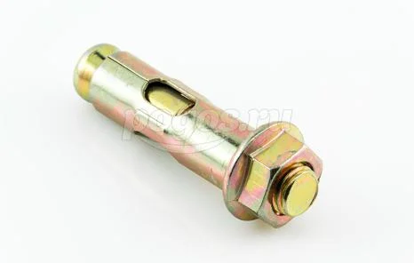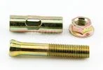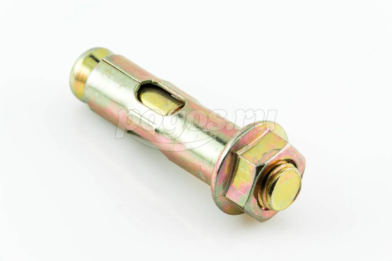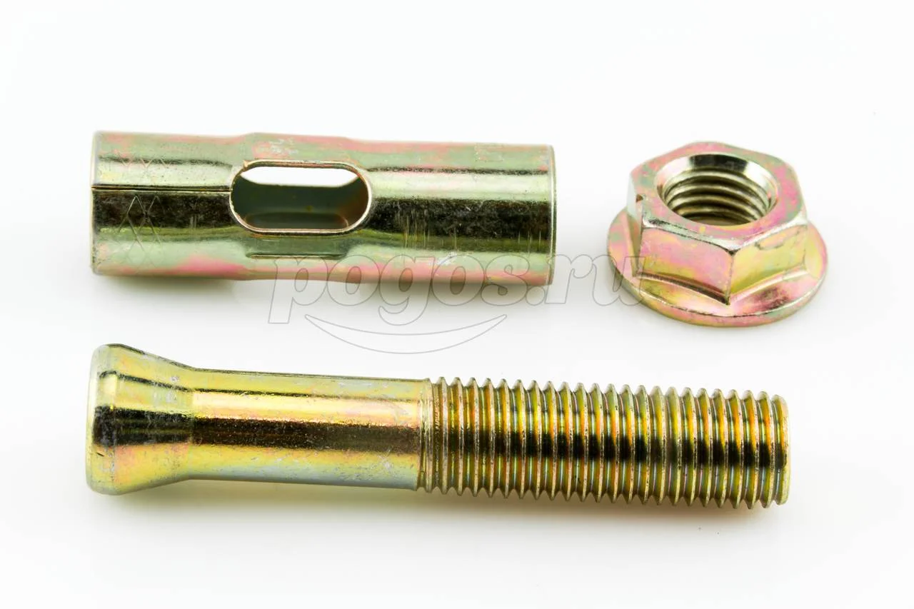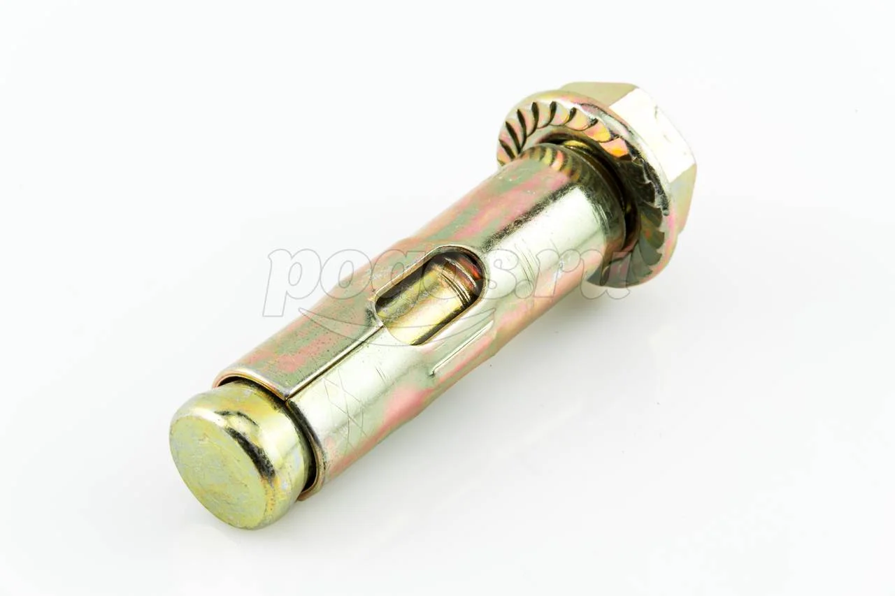 Описание: анкер расклинивающийся в рубашке состоит из распорной гильзы, которая так же имеет рассечения для упрощения анкеровки, стальной шпильки с расширяющейся частью снизу и резьбой сверху на которую накручивается гайка. Между гайкой и распорной частью имеется шайба, которая значительно упрощает монтаж.