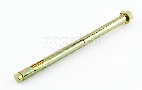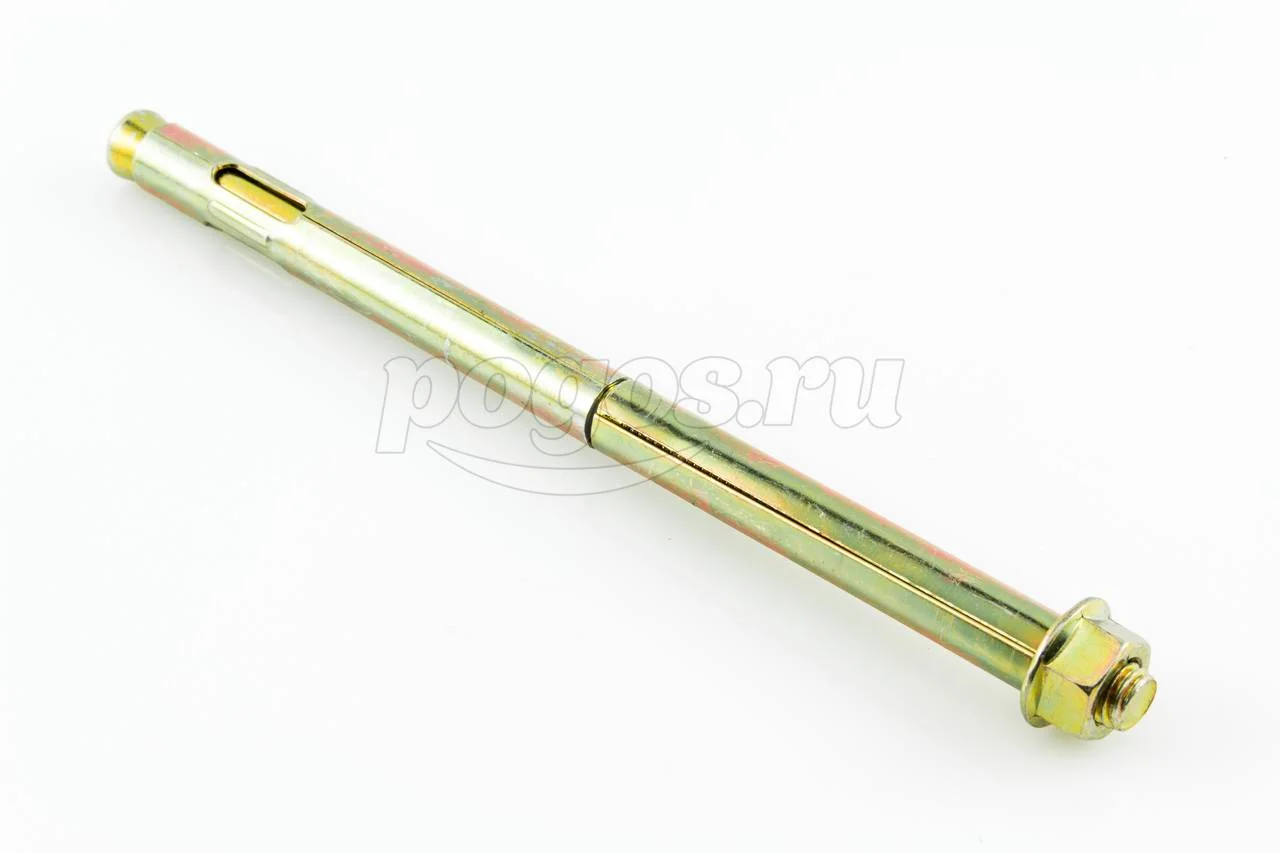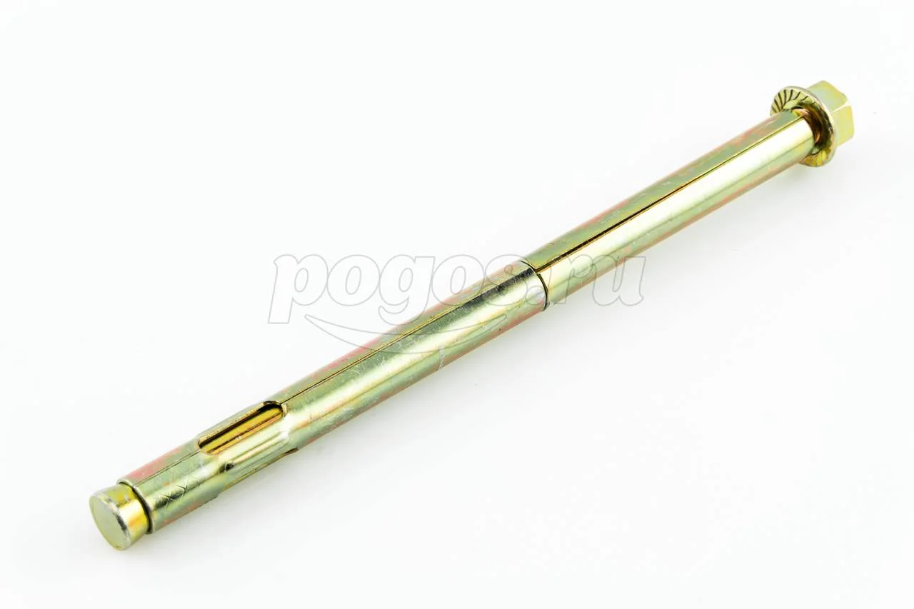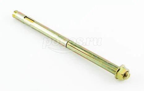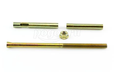 Описание: анкер расклинивающийся в рубашке состоит из распорной гильзы, которая так же имеет рассечения для упрощения анкеровки, стальной шпильки с расширяющейся частью снизу и резьбой сверху на которую накручивается гайка. Между гайкой и распорной частью имеется шайба, которая значительно упрощает монтаж.