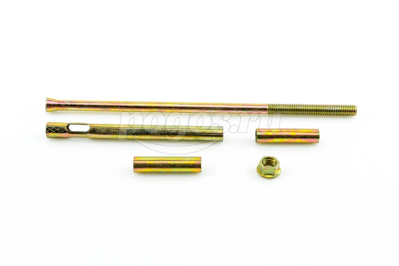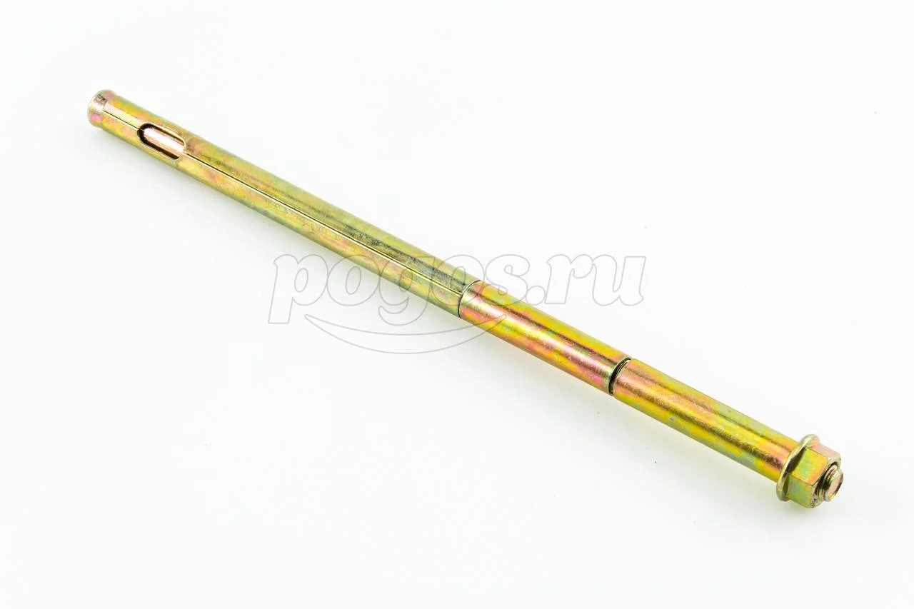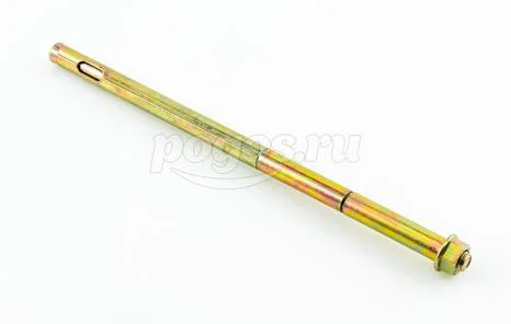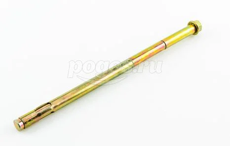 Описание: анкер расклинивающийся в рубашке состоит из распорной гильзы, которая так же имеет рассечения для упрощения анкеровки, стальной шпильки с расширяющейся частью снизу и резьбой сверху на которую накручивается гайка. Между гайкой и распорной частью имеется шайба, которая значительно упрощает монтаж.