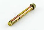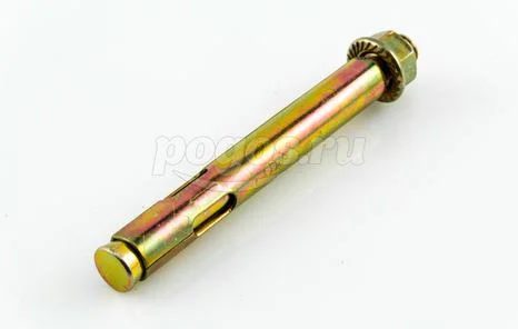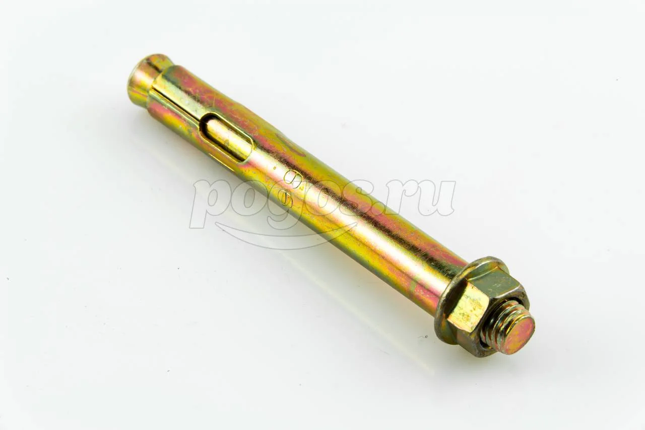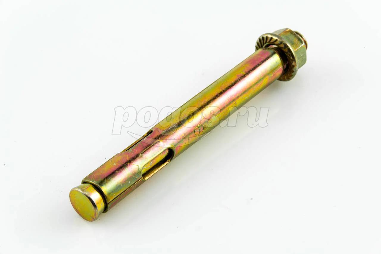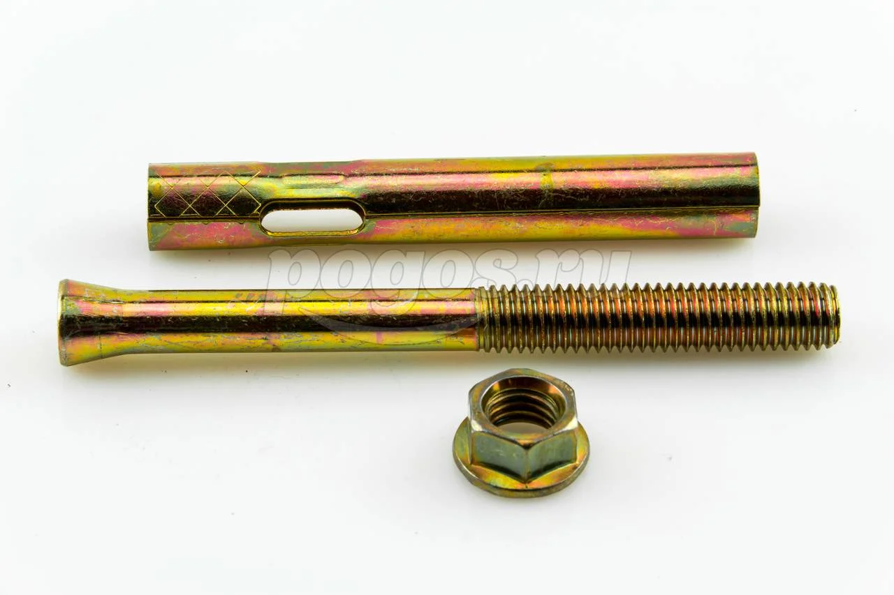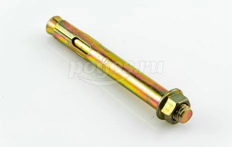 Описание: анкер расклинивающийся в рубашке состоит из распорной гильзы, которая так же имеет рассечения для упрощения анкеровки, стальной шпильки с расширяющейся частью снизу и резьбой сверху на которую накручивается гайка. Между гайкой и распорной частью имеется шайба, которая значительно упрощает монтаж.