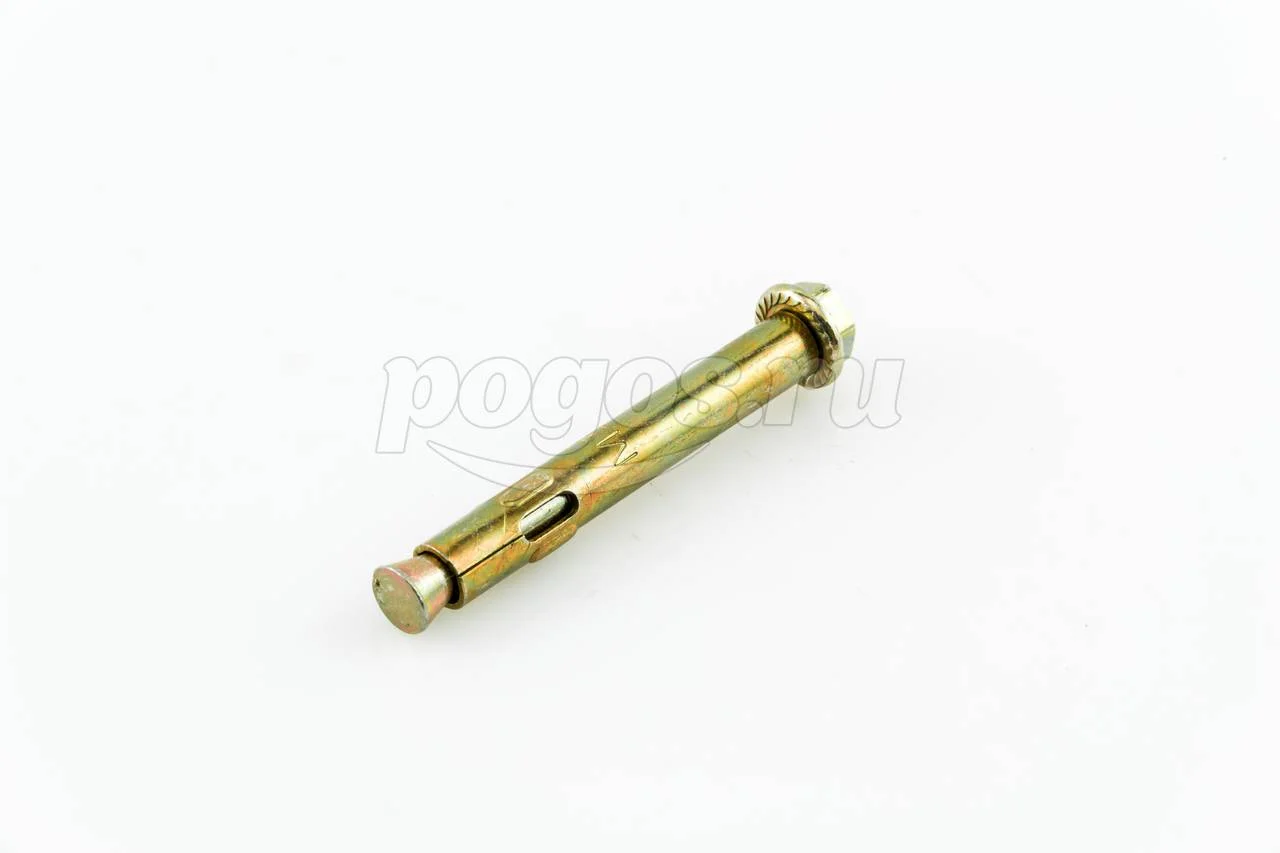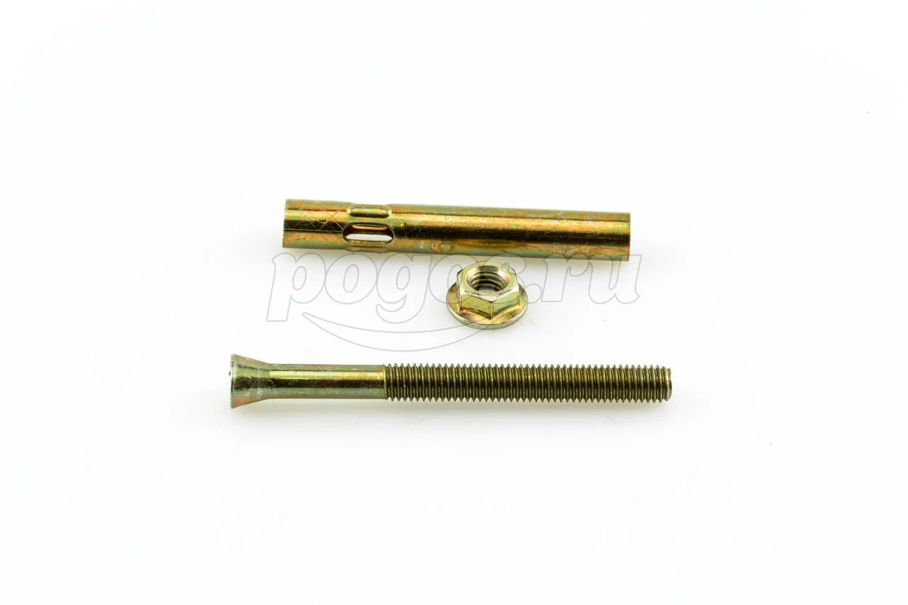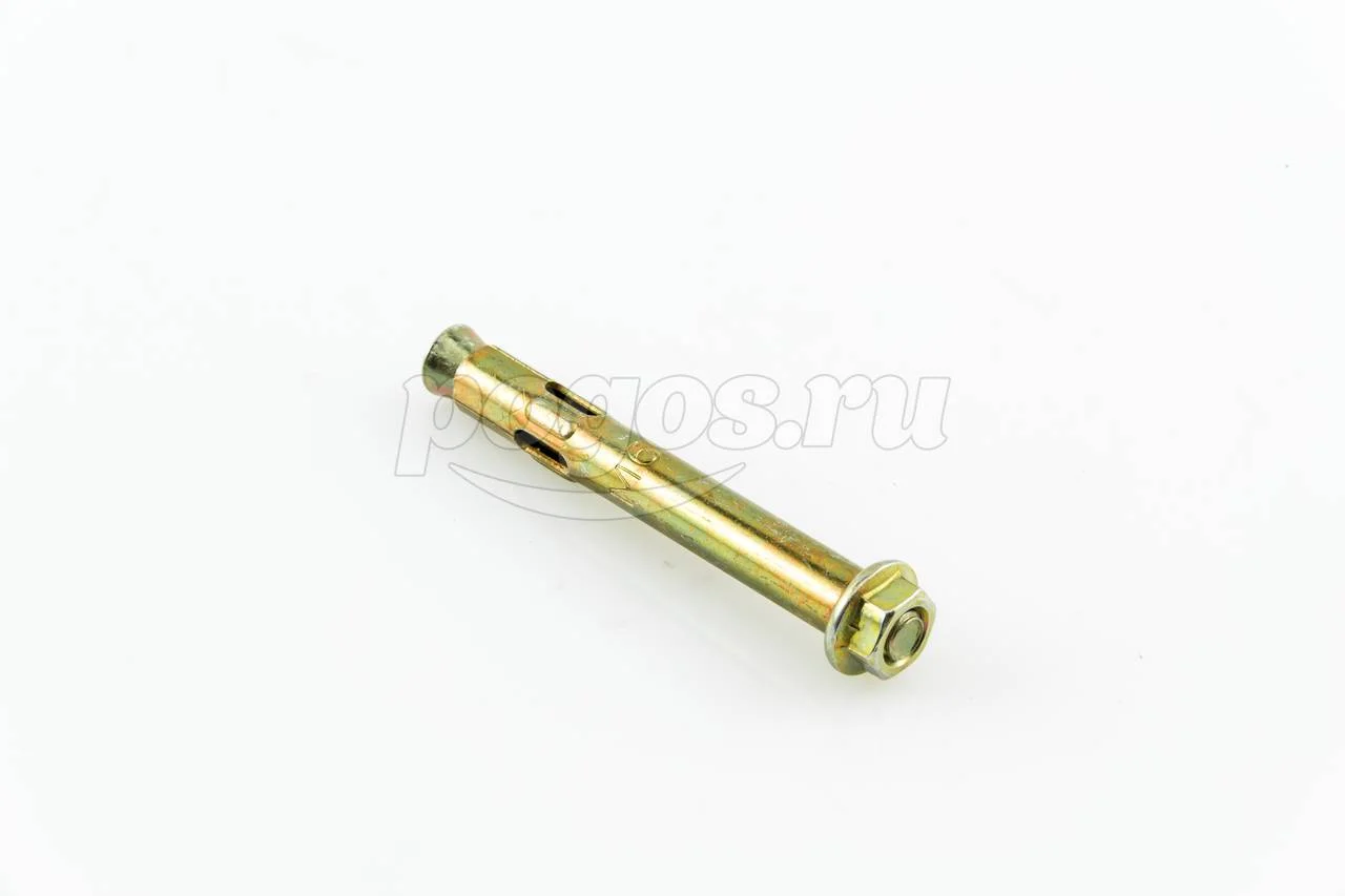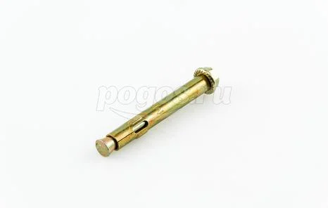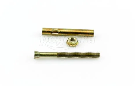 Описание: анкер расклинивающийся в рубашке состоит из распорной гильзы, которая так же имеет рассечения для упрощения анкеровки, стальной шпильки с расширяющейся частью снизу и резьбой сверху на которую накручивается гайка. Между гайкой и распорной частью имеется шайба, которая значительно упрощает монтаж.