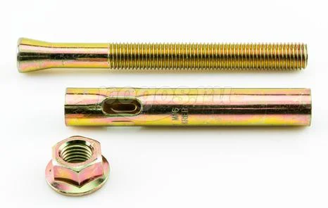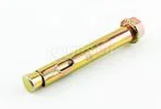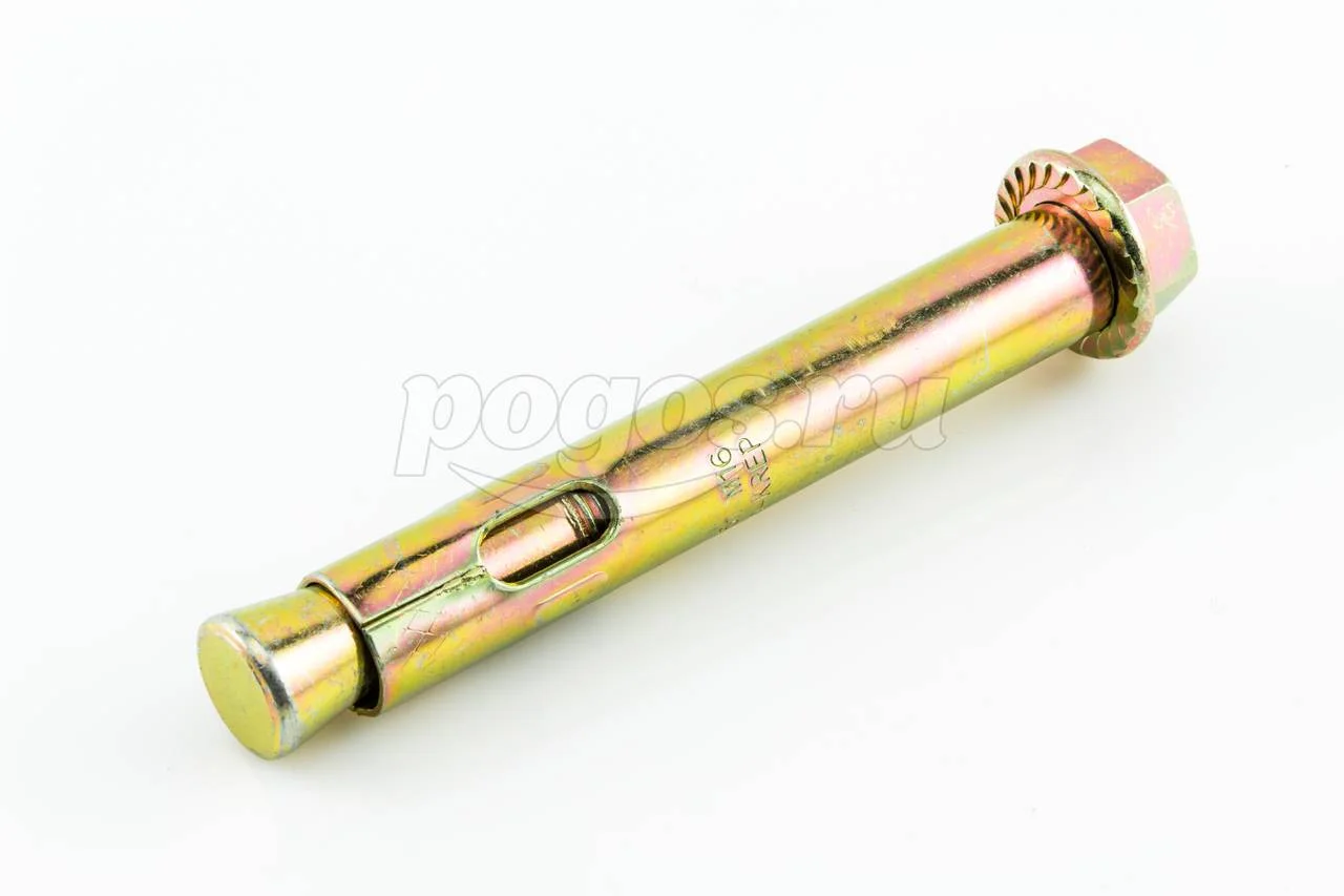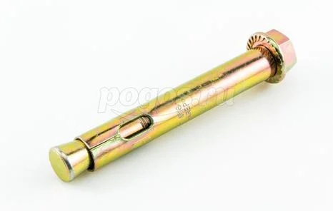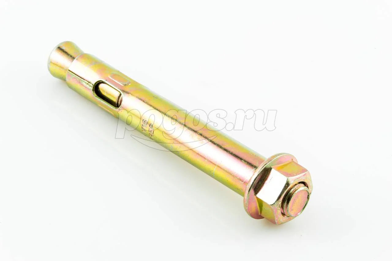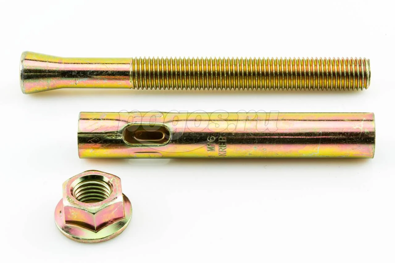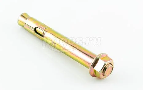 Описание: анкер расклинивающийся в рубашке состоит из распорной гильзы, которая так же имеет рассечения для упрощения анкеровки, стальной шпильки с расширяющейся частью снизу и резьбой сверху на которую накручивается гайка. Между гайкой и распорной частью имеется шайба, которая значительно упрощает монтаж.
