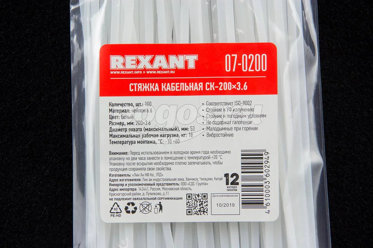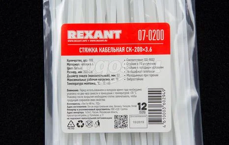 Хомут / стяжка пластиковый 3,6*200 (упаковка 100шт) белый REXANT, артикул: 07-0200