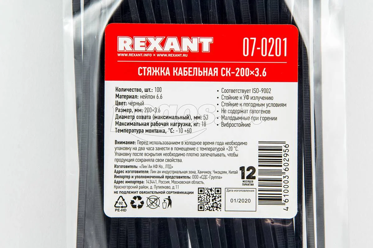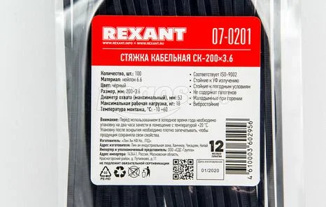 Кабельная стяжка 3,6x200 мм (черная, упаковка 100 шт.) REXANT