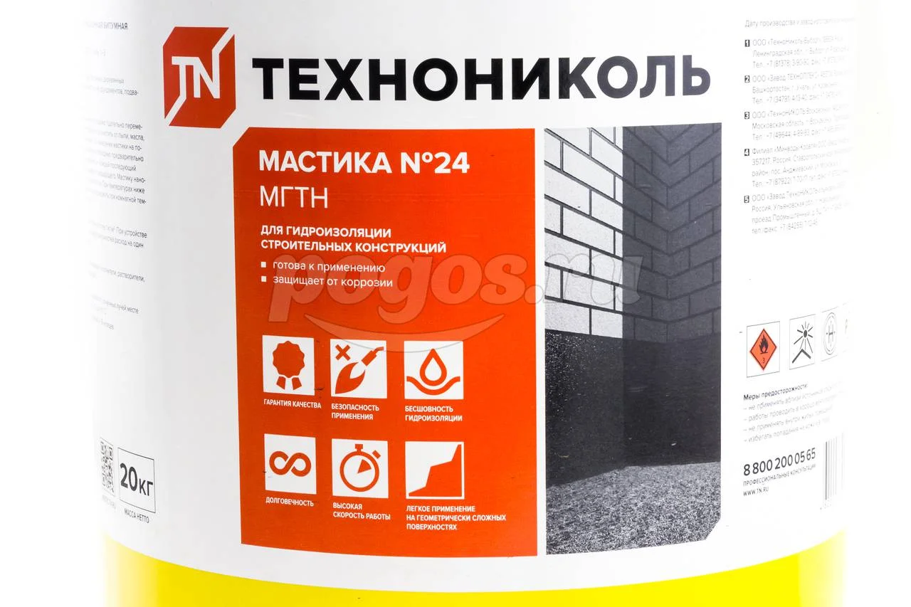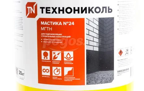 Мастика гидроизоляционная ТЕХНОНИКОЛЬ № 24 (МГТН) представляет собой полностью готовый к применению материал на основе нефтяного битума, содержащий технологические добавки, минеральные наполнители и растворитель.