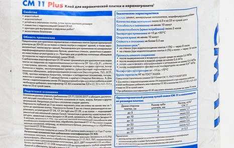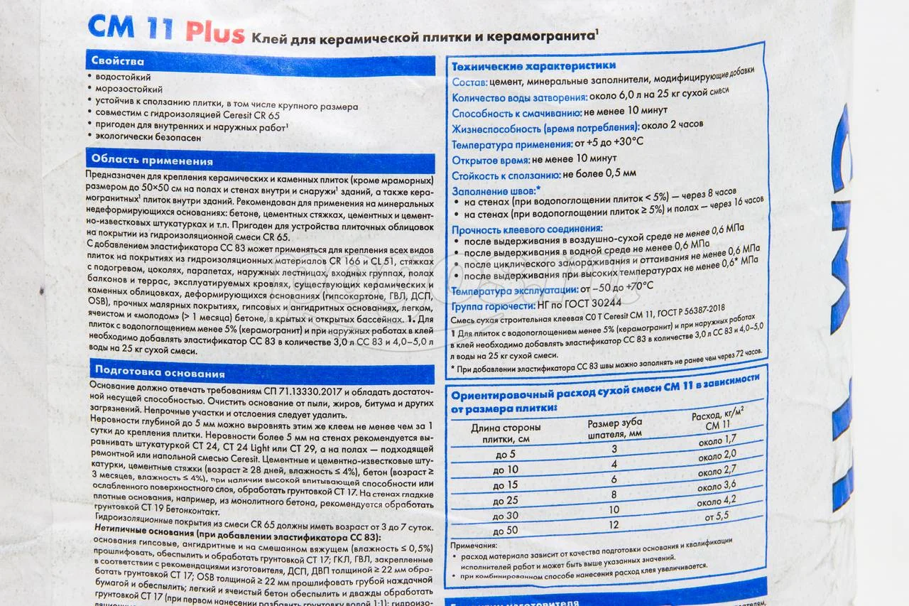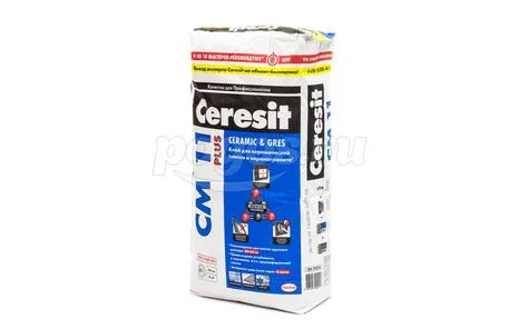 Клей для плитки Сeresit СМ 11 представляет собой порошкообразную смесь для последующего разведения. Состав используется для укладки керамической плитки и керамогранита, предназначен для наружных и внутренних работ. Обеспечивает прочное сцепление с минеральными основаниями (каменными, бетонными и газобетонными, кирпичными, отштукатуренными поверхностями). Помните, что от правильности выбора плиточного клея с нужными характеристиками зависит удобство работы и долговечность отделки: Качественный состав облегчит процесс укладки и корректировки положения плиток. После схватывания клея не появятся требующие исправления дефекты. Элементы плиточного покрытия не будут расшатываться и отваливаться на протяжении всего срока службы.