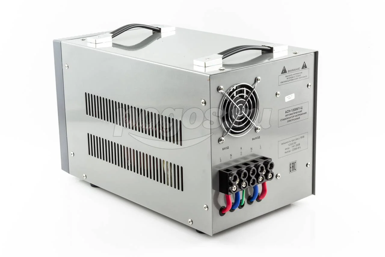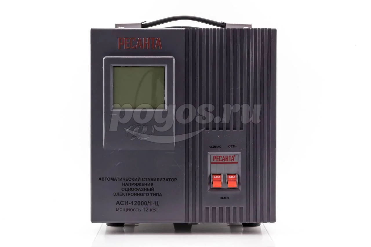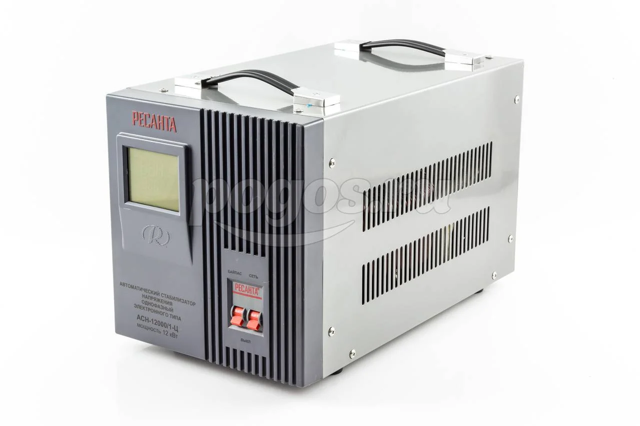 Стабилизатор Ресанта АСН 12000/1 Ц - однофазное устройство для выравнивания входного напряжения и защиты приборов от высоких скачков напряжения с суммарной мощностью до 12 кВт.