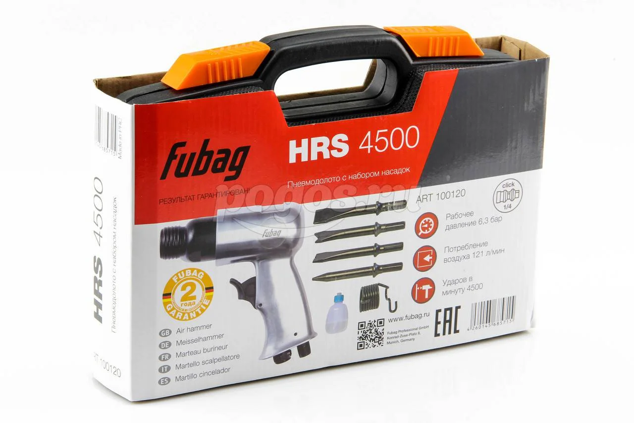 Пневмодолото FUBAG HRS4500 100120 работает с металлическими, каменными, бетонными, пластиковыми материалами.