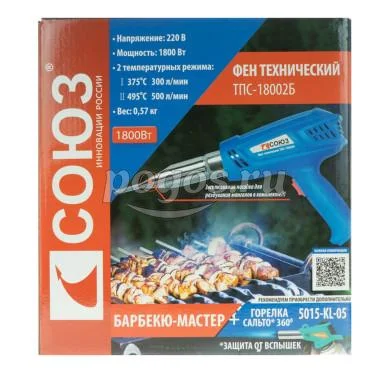 Фен технический 220В 1800Вт 2 ступени, 3 насадки Барбекю-Мастер СОЮЗ, артикул: ТПС-18002Б