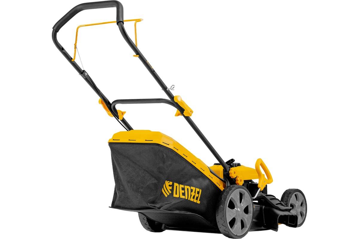 Бензиновая газонокосилка Denzel GLD-460-K 58814 с двигателем объемом 150 см³ и травосборником объемом 50 л обеспечивает ширину скашивания 46 см. Предназначена для стрижки газонов и кошения травы в саду и огороде.