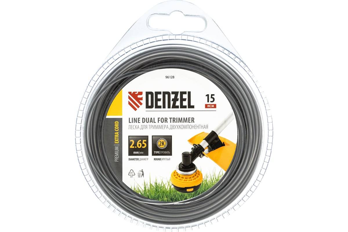 Двухкомпонентная леска Denzel Extra cord 96128 круглого сечения, размером 2,65 мм х 15 м, используется с бензиновыми триммерами высокой мощности. Подходит для покоса как молодой, так и сухой травы, бурьяна, молодой поросли малины и других кустарников. Леска состоит из двух частей — высокопрочного сердечника и пластичной внешней оболочки. Такое решение повышает рабочий ресурс режущего элемента до 40% по сравнению с традиционными лесками.