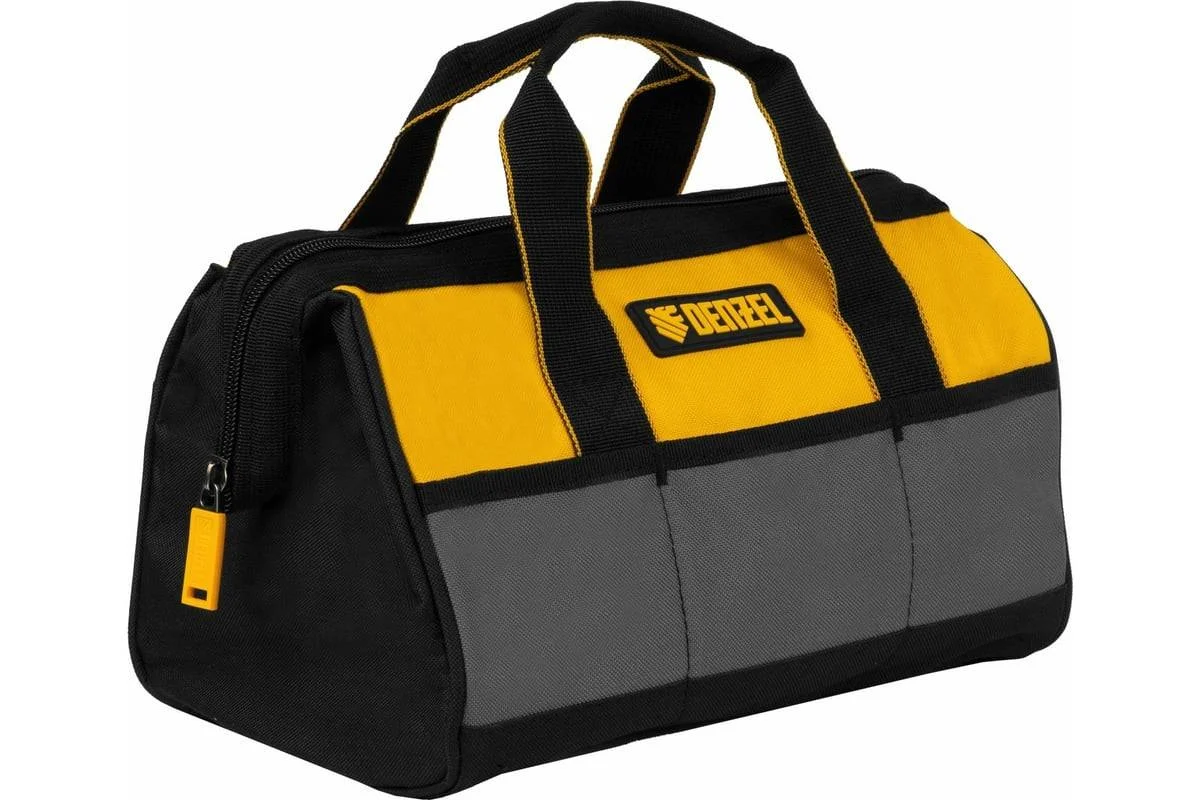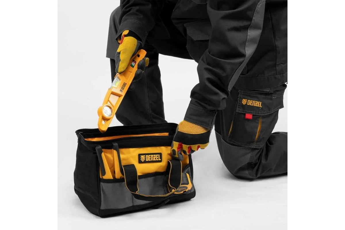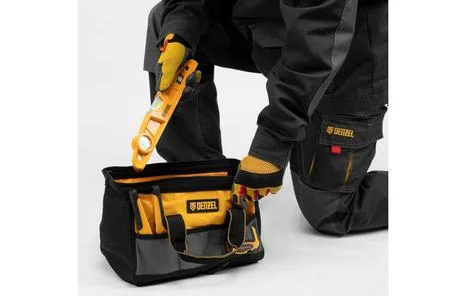 Сумка для инструмента Denzel 305x190x195 мм, 14 карманов 90292 предназначена для транспортировки и хранения ручного инструмента. Внутренние и внешние карманы удобны для быстрого доступа к нужному инструменту. Оснащена двумя ручками для переноски и молнией для быстрого доступа к инструменту (металлический бегунок с пластиковой оболочкой). Данная модель удобна, как при выездных работах, так и для хранения инструмента, например, в машине, на даче или дома. Материал сумки - плотный полиэстер (600 D), устойчивый к истиранию. Сумка оснащена 14 карманами и характеризуется компактным размером. Конструкция сумки усилена стальной проволокой диаметром 3 мм.