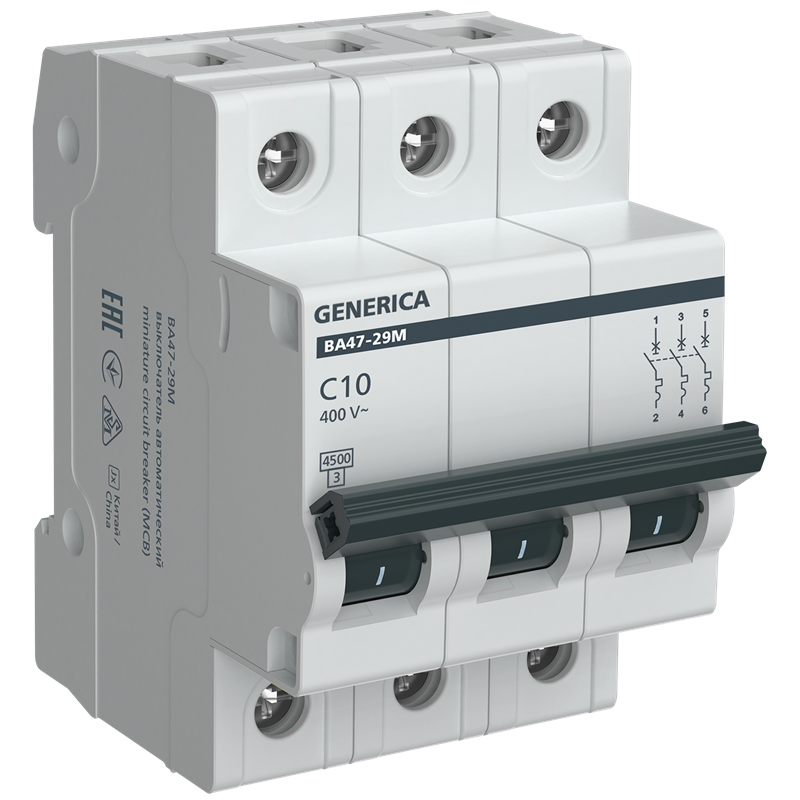 Выключатель автоматический ВА47-29М 3п C 10А 4.5кА GENERICA, артикул: MVA21-3-010-C-G