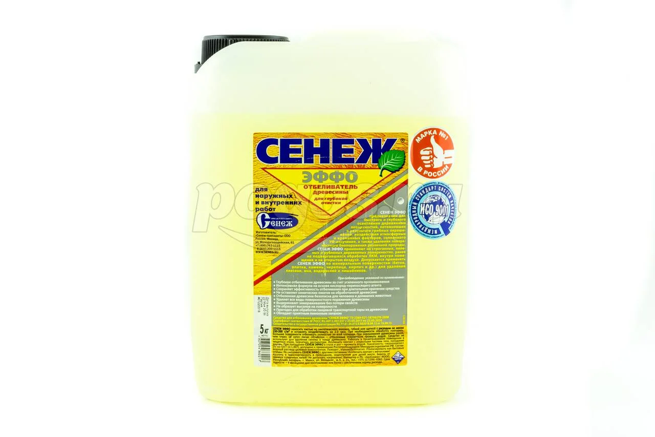 Отбеливатель СЕНЕЖ ЭФФО предназначен для быстрого глубокого осветления деревянных поверхностей, потемневших в результате грибных окрашиваний, воздействия атмосферных и временных факторов, солнечного УФ излучения, а также удаления поверхностного биопоражения различной природы.