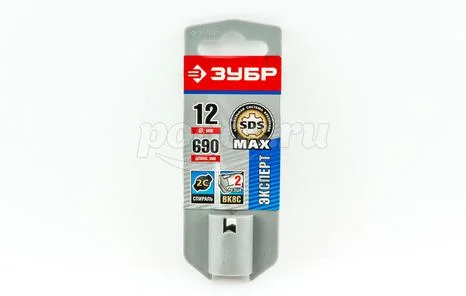 Бур производителя ЗУБР 29350-690-12_z01 с SDS-Max хвостовиком служит для сверления с ударом в твёрдом бетоне, в любых кирпичных кладках, а также в искусственном и природном камне.