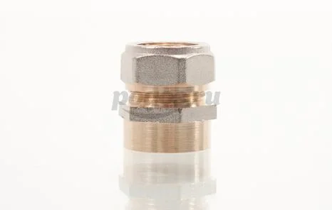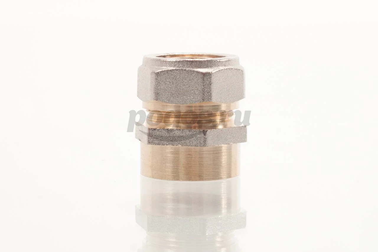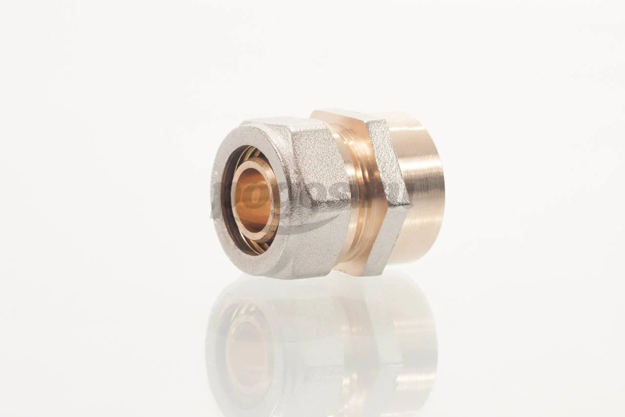 Обжимной соединитель с переходом на внутреннюю резьбу — это прямая латунная никелированная деталь для соединения металлополимерной трубы и компонента системы с резьбовым подключением.
